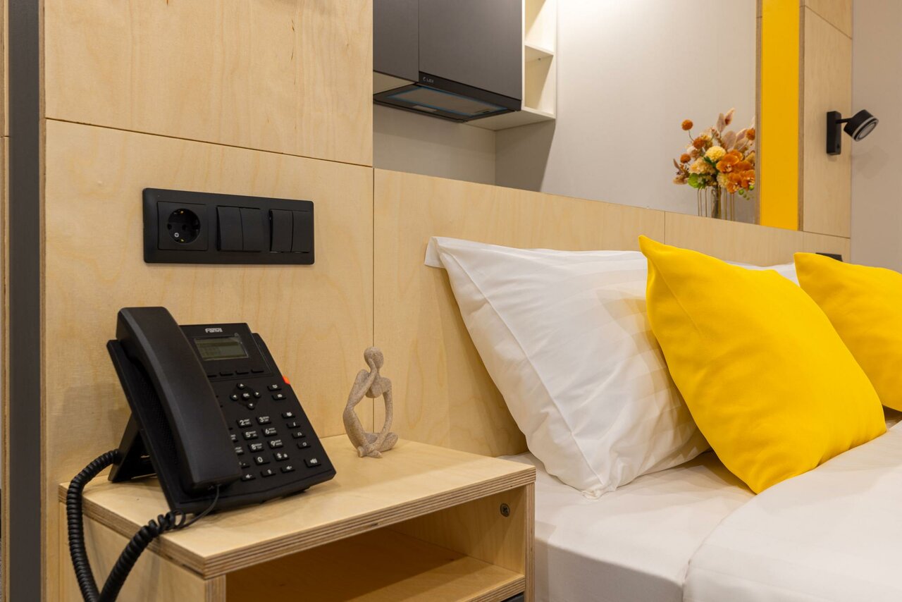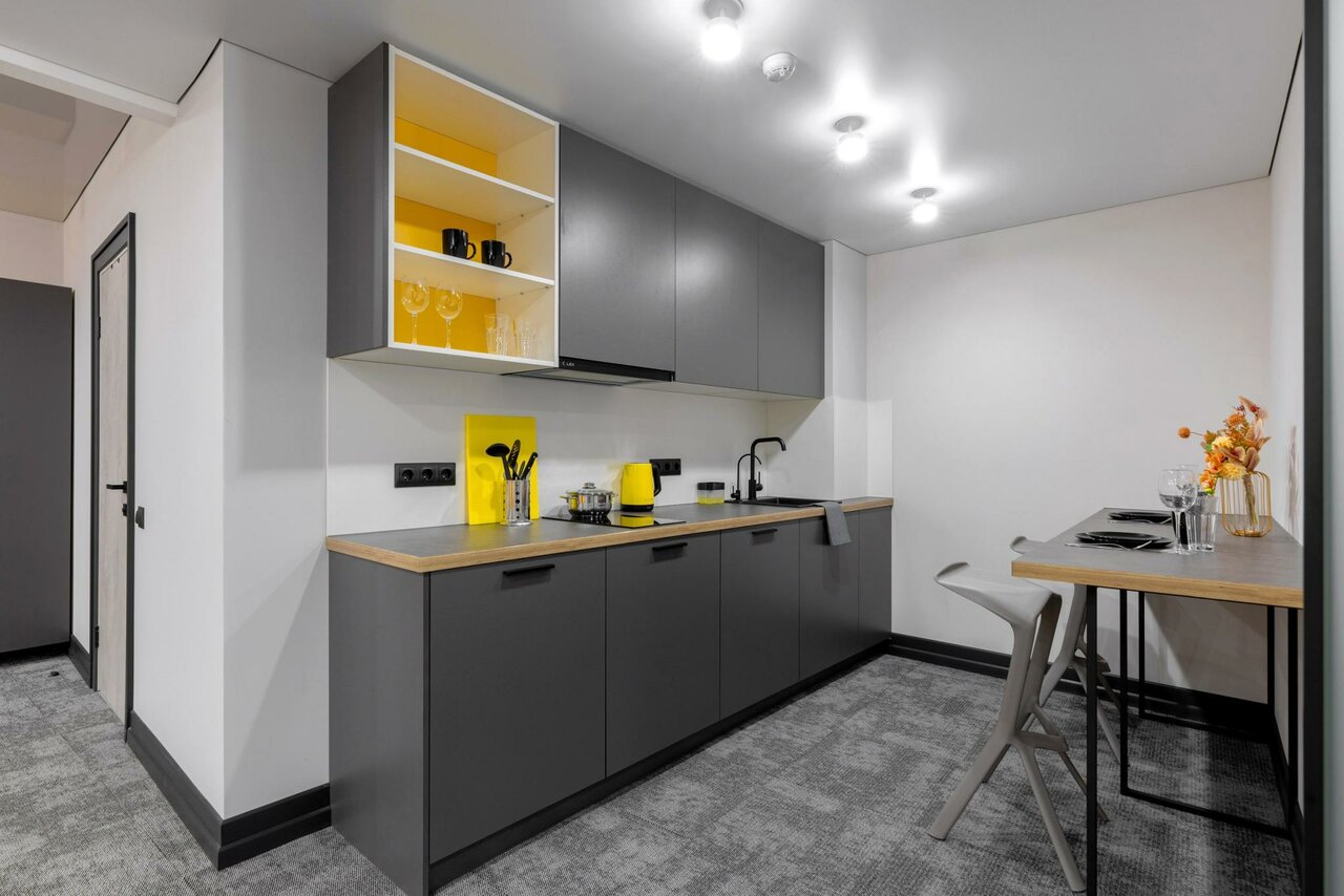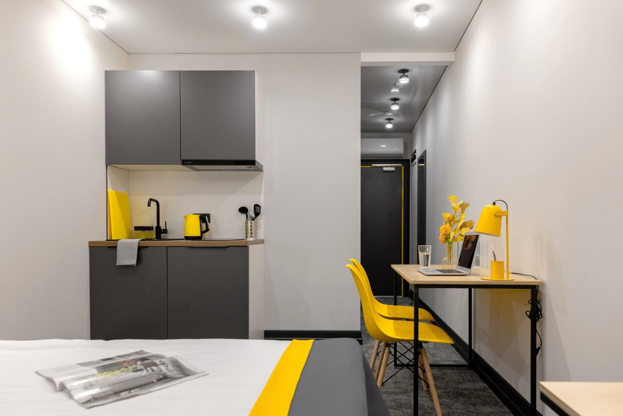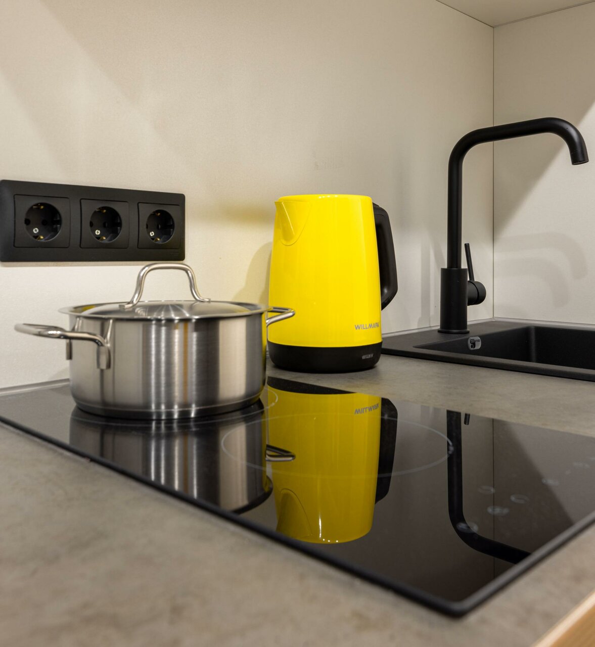 Номер 18-20 м2 с удобной двуспальной или 2 раздельными кроватями и креслом-кроватью. В номере расположены: кухонная зона, холодильник, чайник, микроволновая печь и индукционная плита. Кондиционер в летний период.
