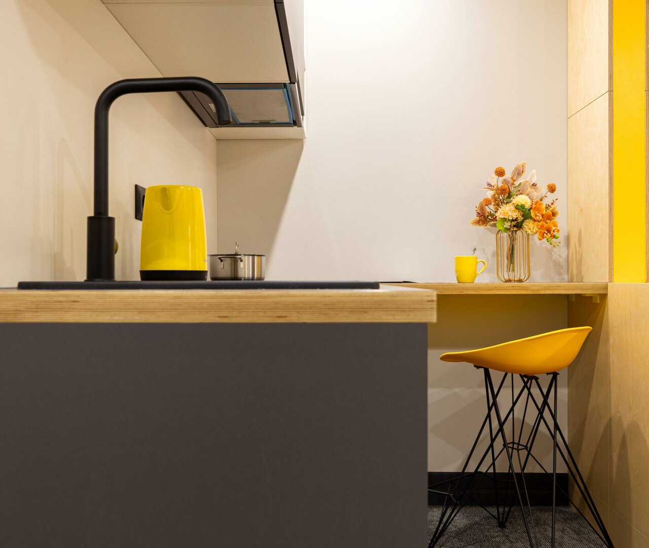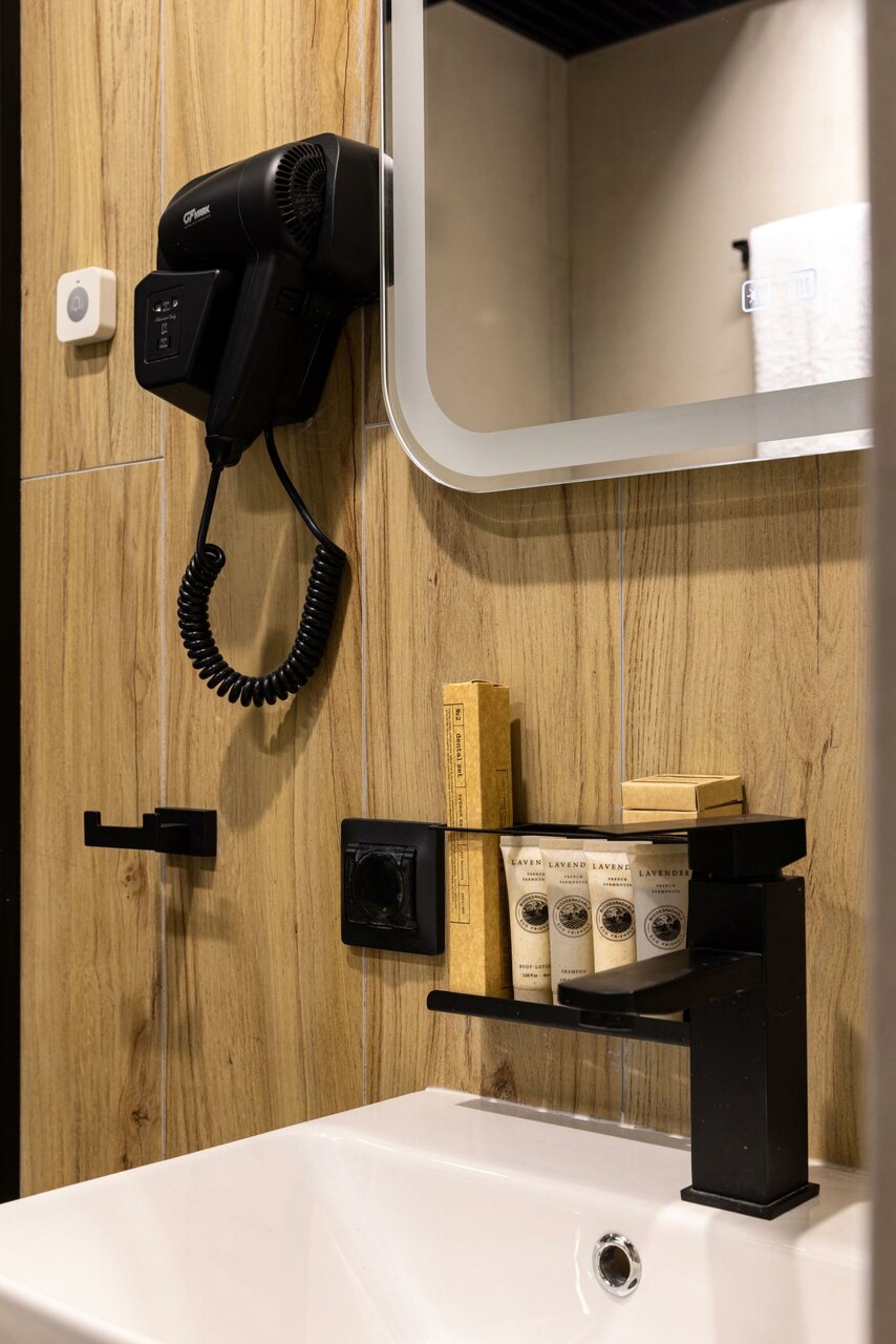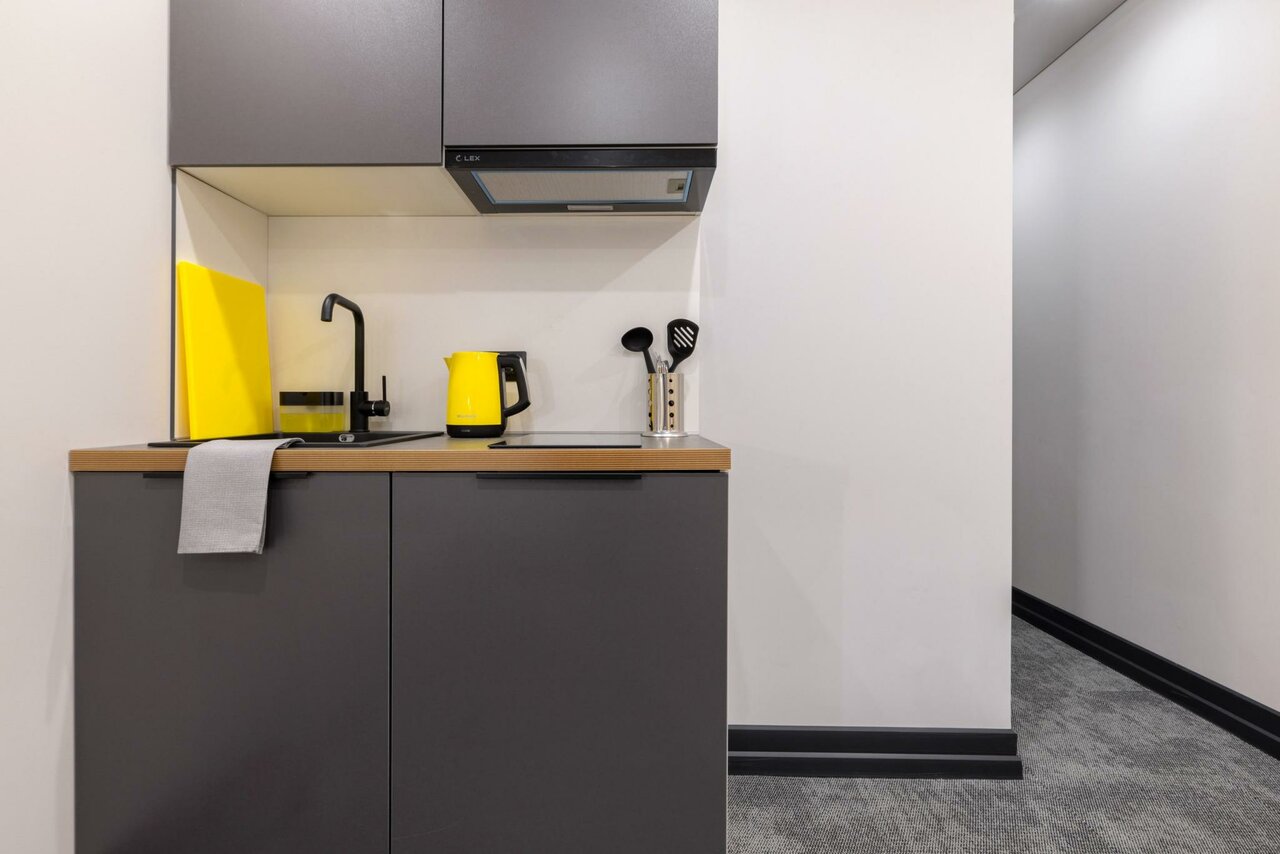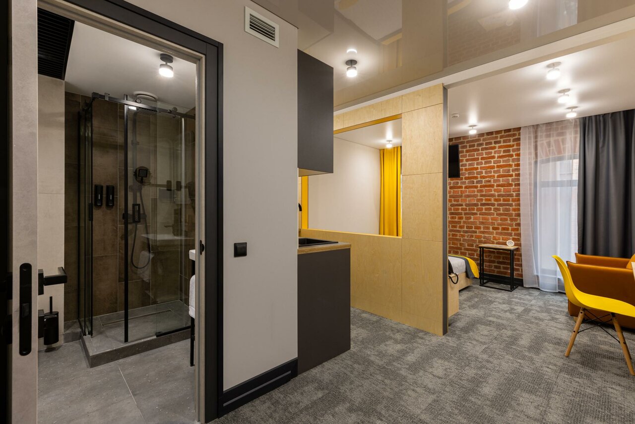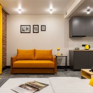 Номер площадью 16-18 м2 выполнен в стиле лофт с удобной двуспальной или 2 раздельными кроватями. В номере расположены: кухонная зона, холодильник, чайник, микроволновая печь и индукционная плита. Кондиционер в летний период.