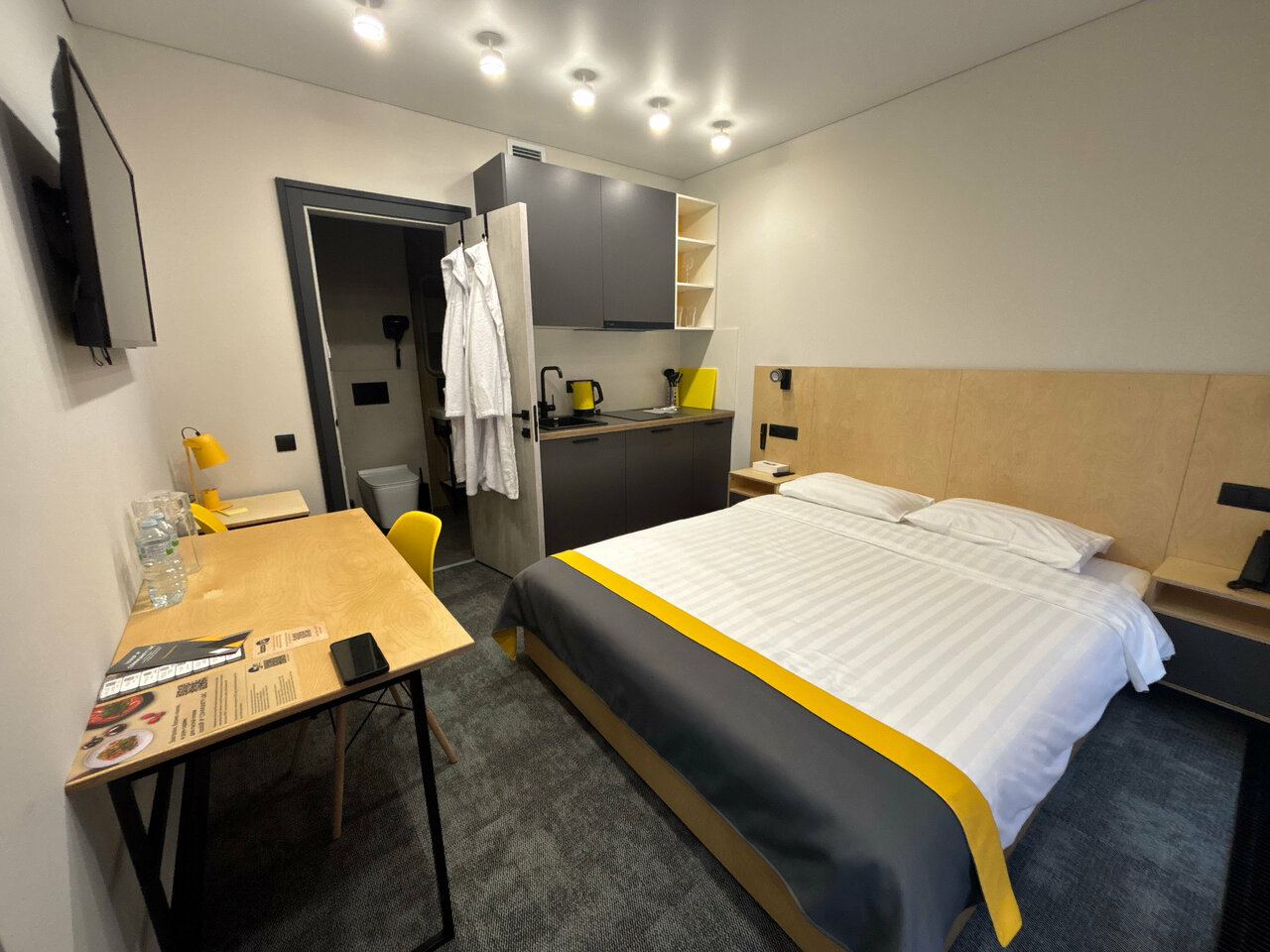 Эргономичный номер площадью 12-15 м2 идеально подойдет для сольных путешественников. Для Вашего удобства в номере расположены: двуспальная кровать 120х200 с ортопедическим матрасом, оборудованная мини-кухня с набором посуды для приготовления и сер...