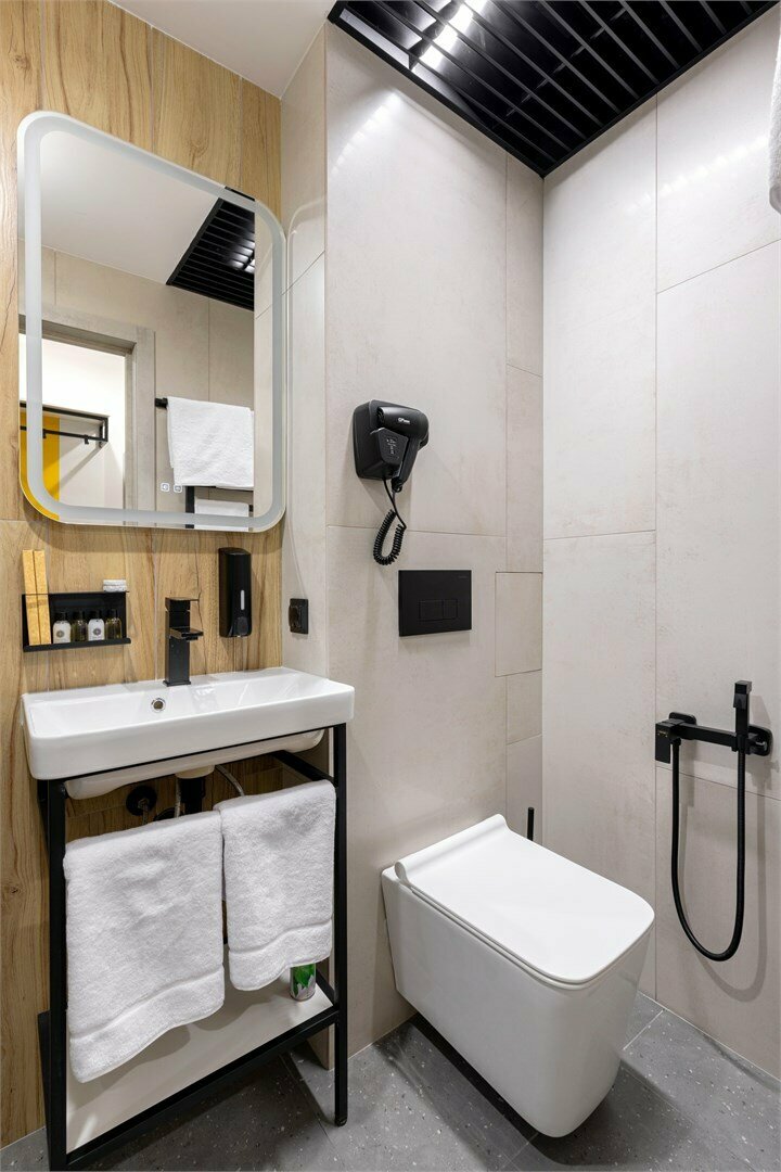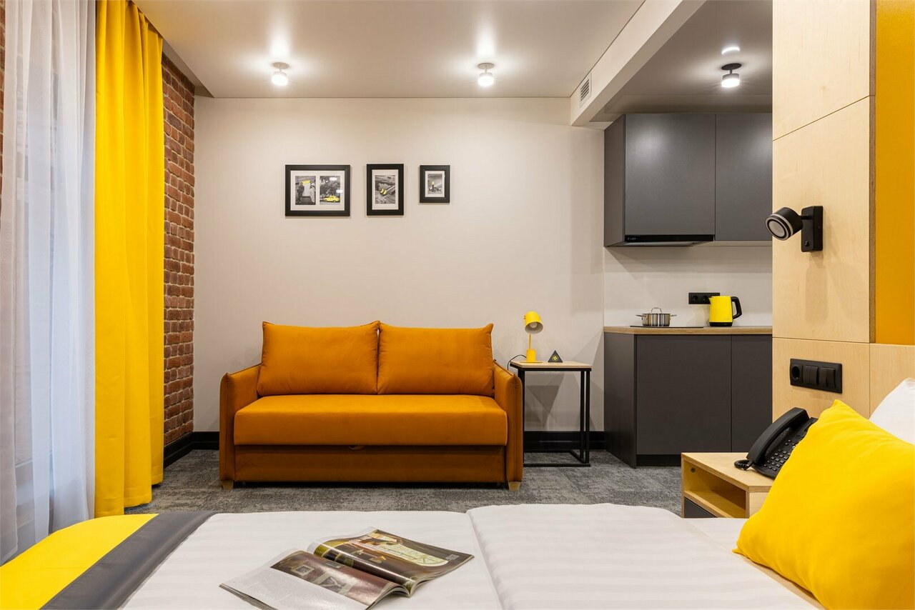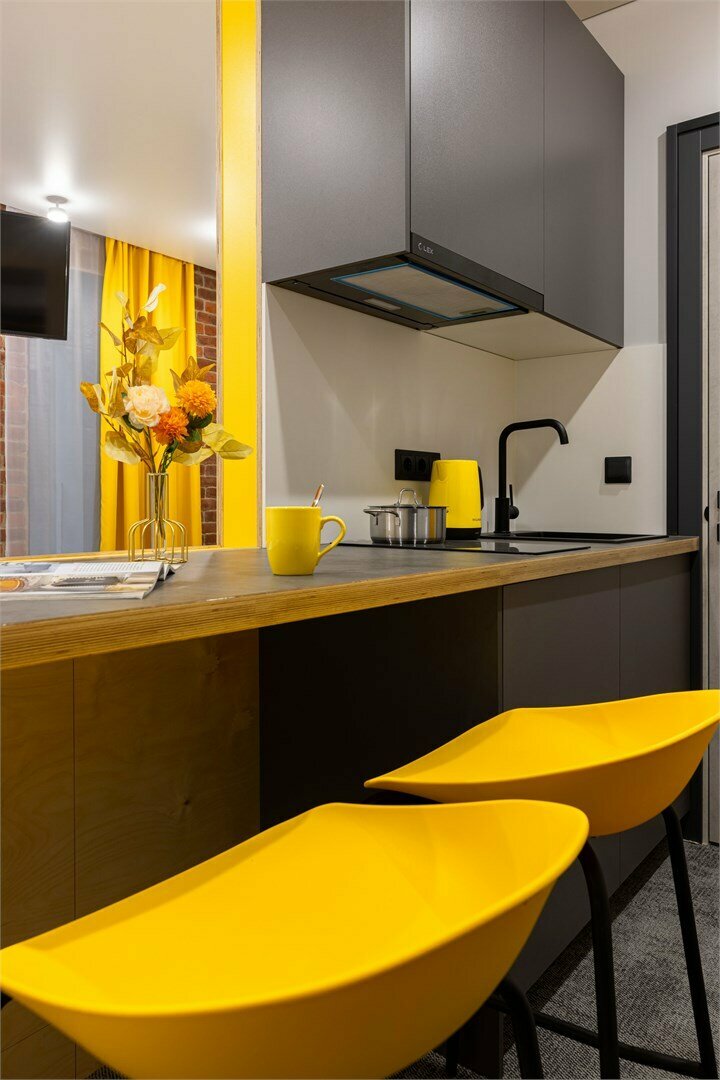 Гармоничный номер площадью 16-18 м2 выполнен в стиле лофт с удобной двуспальной 160х200 с ортопедическим матрасом. Для Вашего удобства в номере расположены: оборудованная мини-кухня.