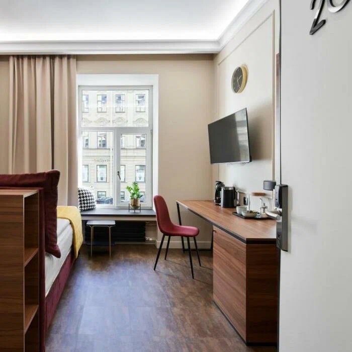 - Тихие номера (хорошая звукоизоляция).; Современный и стильный интерьер.; Наличие кафе и ресторанов рядом.; Дополнительные удобства (капсульная кофемашина, колонка "Алиса", сушилка для обуви).; Гибкие условия заезда/выезда (ранний заезд, поздний выезд без доплат).