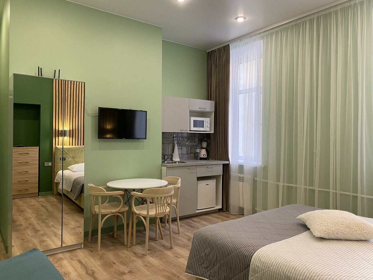 Это лучший апарт-отель из всех, где я была! Идеально чисто, красиво, уютно! Полотенца и белье белоснежные. Брали семейный номер, в нем 2 двуспальные кровати (для нас и ребёнка 11 лет). Есть всё необходимое: стиральная машинка, утюг, гладильная доска, чайник, микроволновка, фен, холодильник, посуда, даже сушилка для одежды и горячий полотенцесушитель!. Ремонт прекрасный. Сотрудники отеля при необходимости всегда на связи. Удобная большая ванная комната с душем, шампунем и гелем для душа. Центр города. Всегда будем останавливаться только здесь!