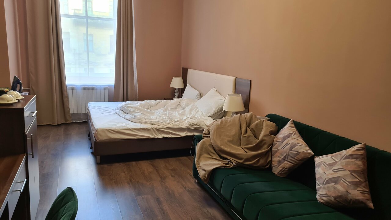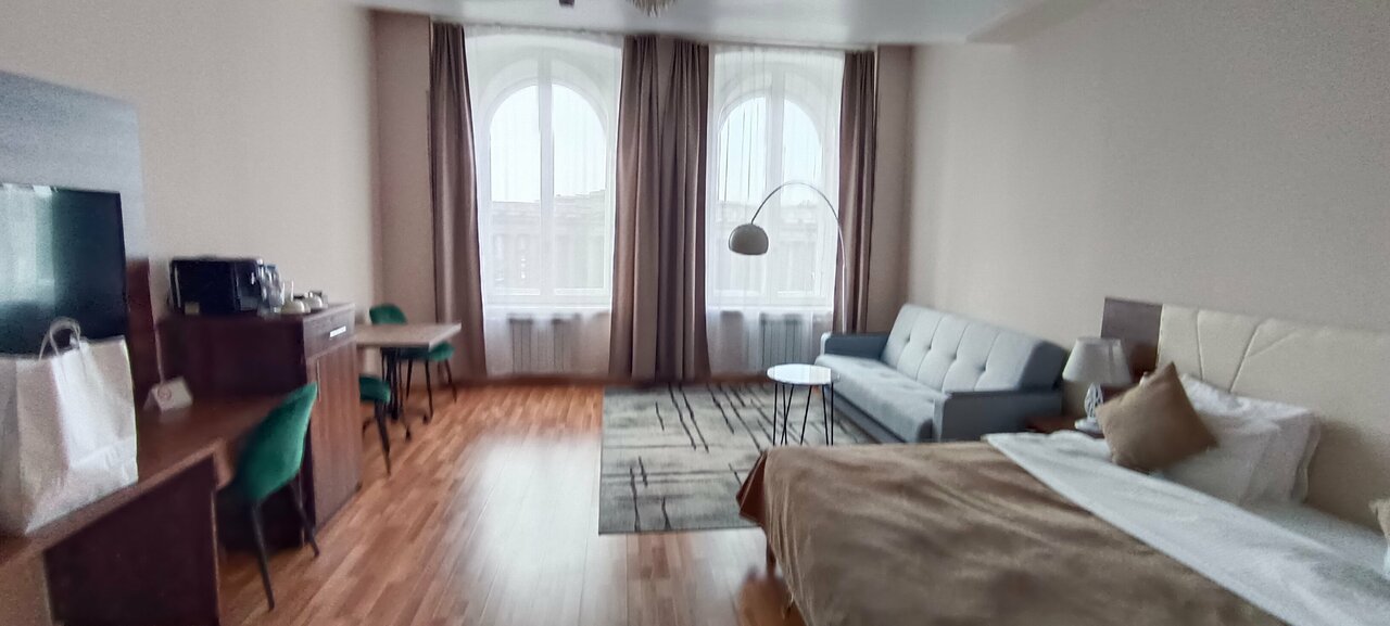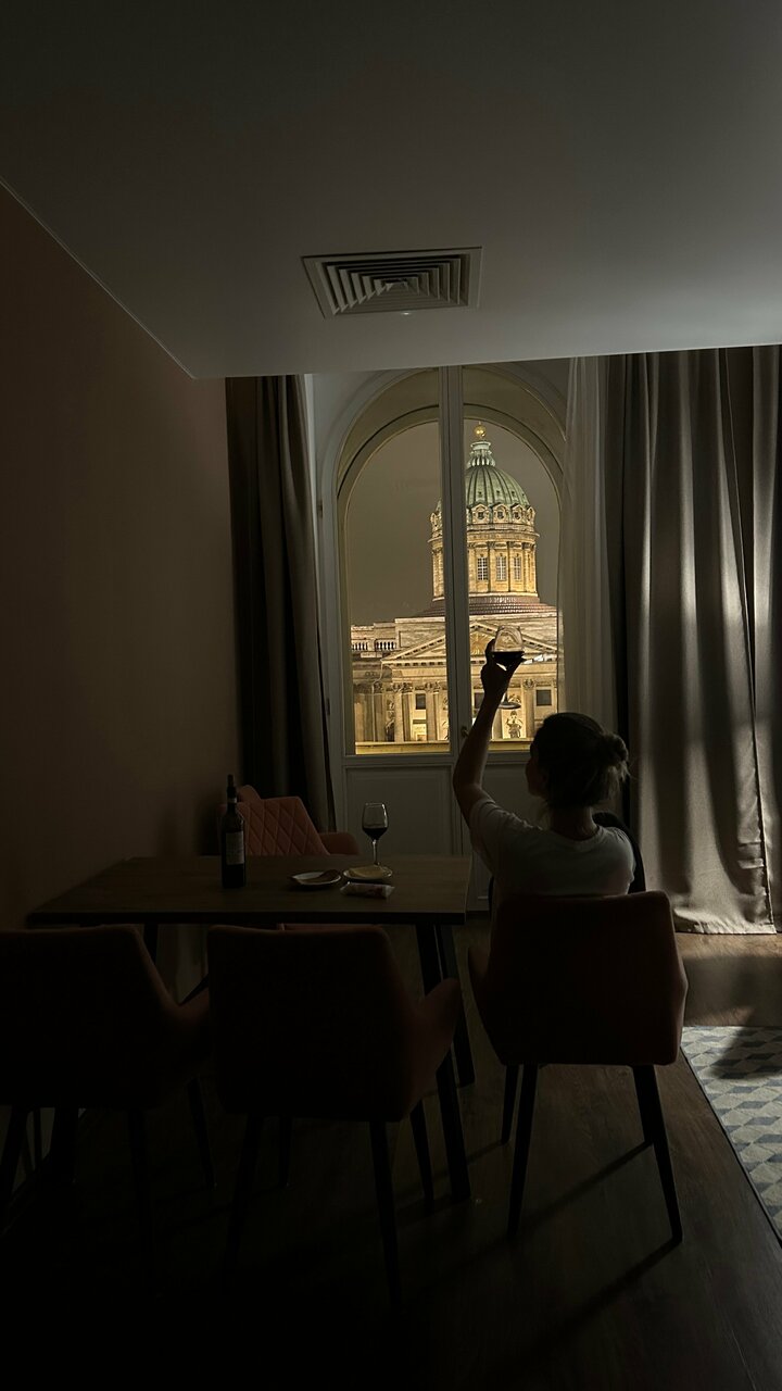 Расположение отличное,персонал вежливый и отзывчивый,уборка и пополнение средств личной гигиены ежедневно,вид шикарный из окна,благодарны,что бронировали просто люкс с балконом,а нам за эти же деньги предоставили с видом на казанский собор на 5 этаже. Единственное балкон прям мааалюсенький,не посидишь с чашкой кофе,только стоя) и балконные двери рассохлись,поэтому не открывались на всю. Ну и на сайте есть информация о проживании свыше 3х ночей,что третья ночь в подарок. Но когда мы уточнили про эту акцию,сказали,что не распространяется в июле,хотя мы жили 7 дней. Ну а в целом неплохо.