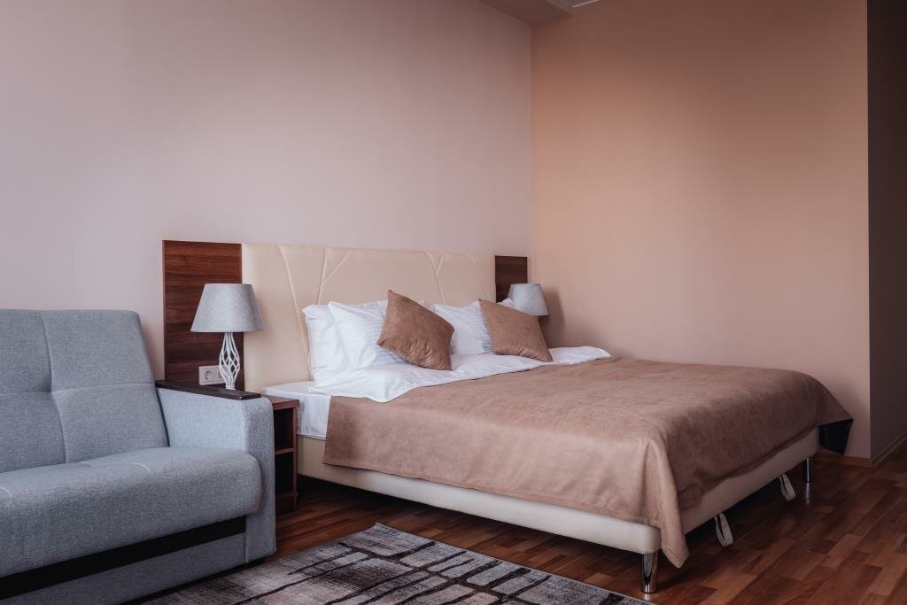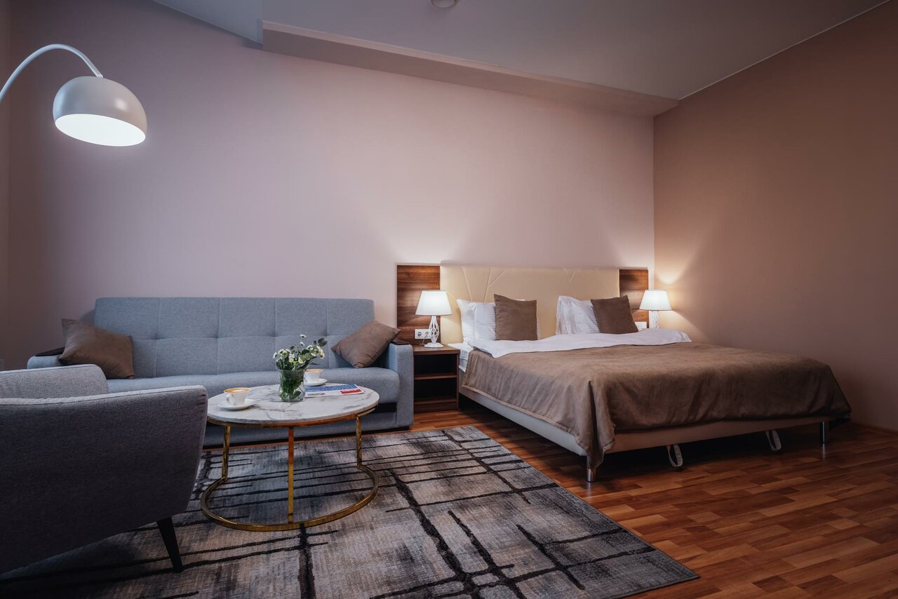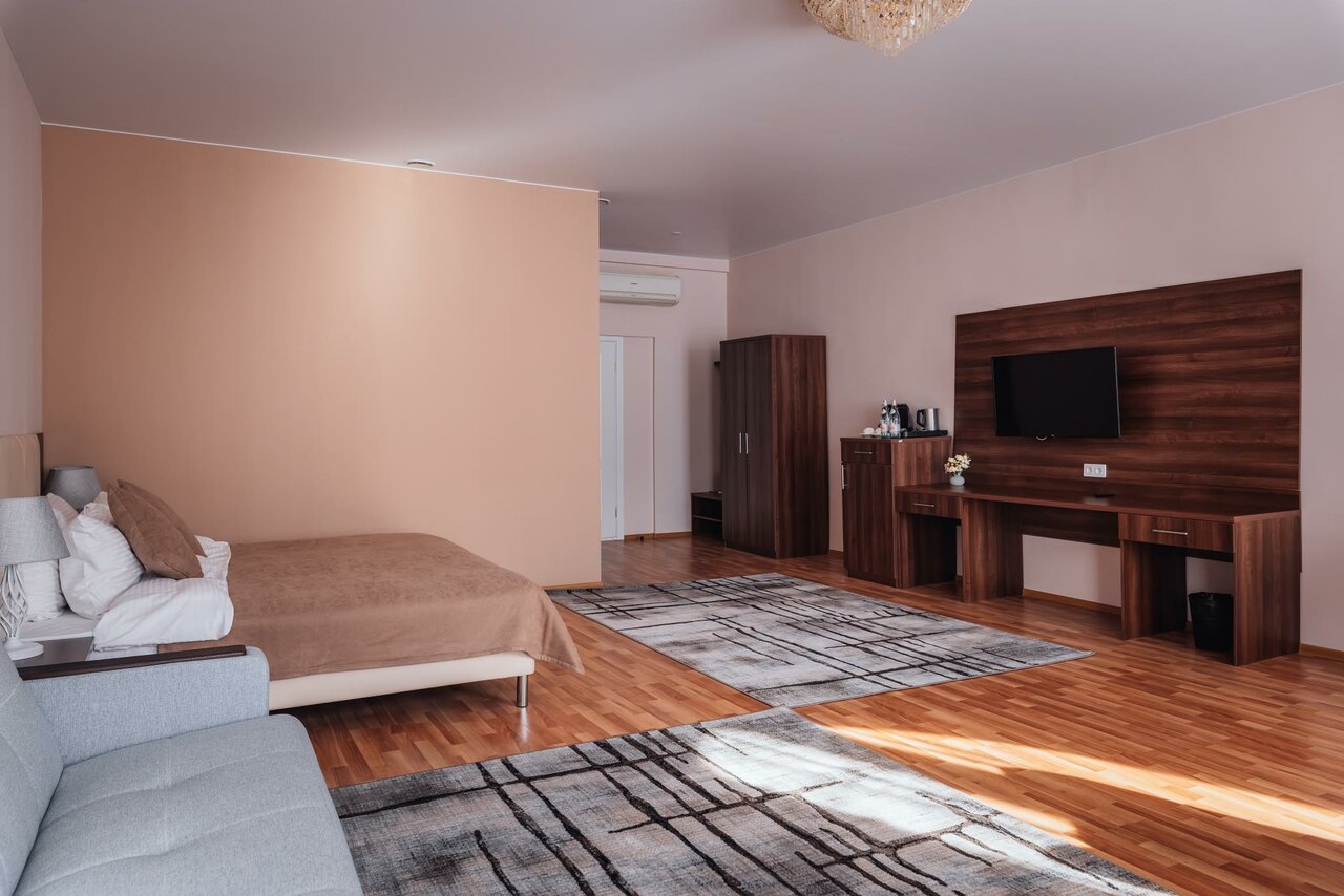 Площадь 40- 45 кв. м.Номер подходит как для 2-х местного размещения, так и для размещения семьи из 3-4 человек. Кровать King size, уютные кресла, диван, стол, плазменный TV, телефон, wi-fi, кондиционер, сейф, холодильник.