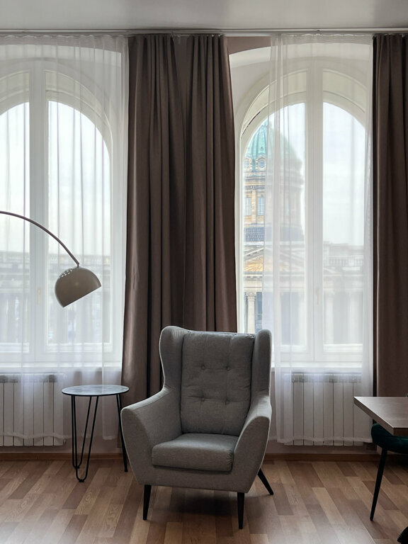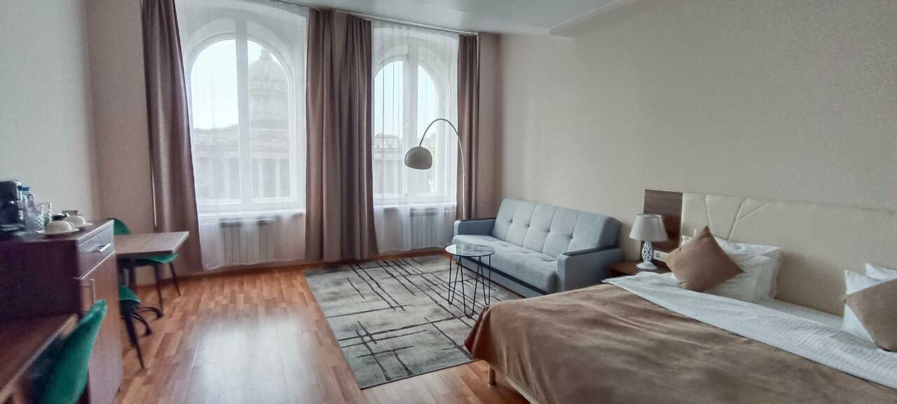 Великолепный фронтальный вид на Казанский собор и панорамные окна сделают Ваш отдых незабываемым! Кровать размером king-size (при необходимости, номер может быть оборудован двумя полутороспальными кроватями).