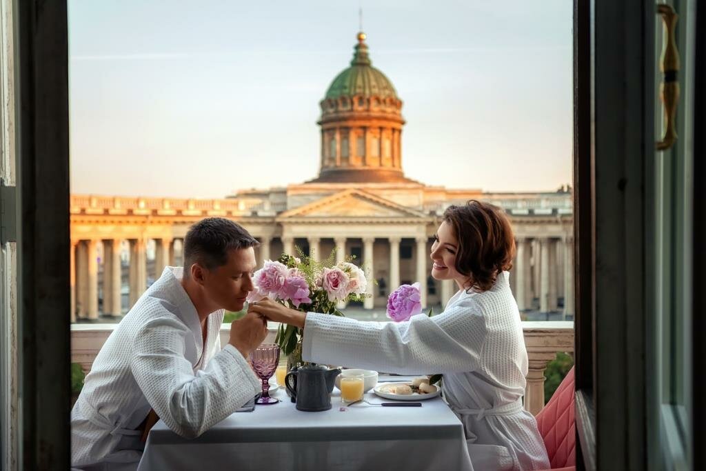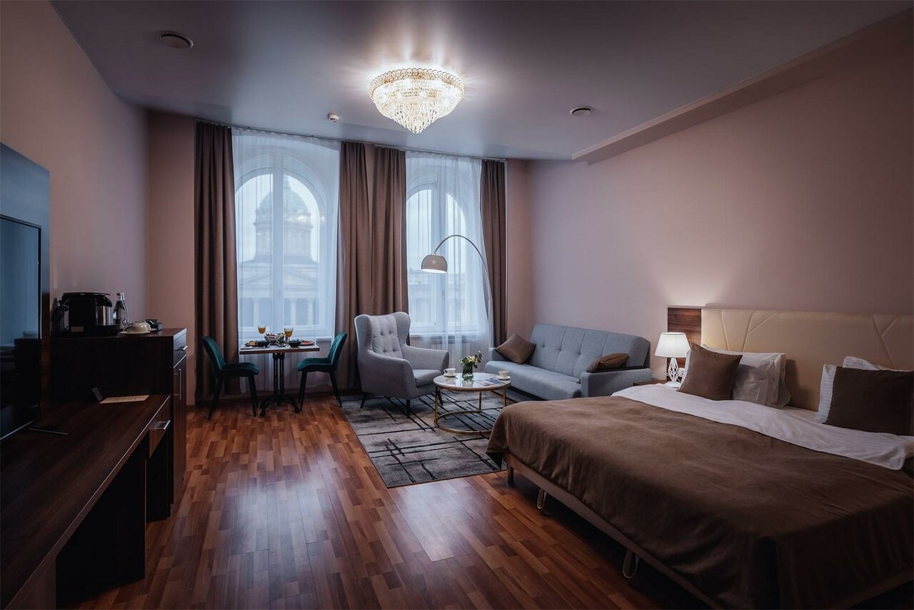 Мой любимый отель в городе. Отличное местоположение. Само здание красивое. Красивый вид на казанский собор из номера. В номере чисто,уборка проходит каждый день. Большая ванная,полотенца и халаты тоже заменяют каждый день.Зубные щетки и все что может пригодится. В номере также много удобств:кондиционер,массажное кресло,вода в бутылках,кофе машина. Также бар и удобные выходы прям в центр.