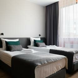 Новый отель, приятный ремонт, хорошие номера, для двоих — идеальный вариант. Полотенца, фен, утюг, доска, сушка для белья, стиральная машина с средством для стирки, небольшой холодильник — все в наличии. Достаточно удобное расположение — 7 минут пешком до метро, 5 минут до остановки автобуса (маршрут №2 едет в исторический центр), также рядом есть пара очень неплохих кафе (Мама Рома, Евразия).