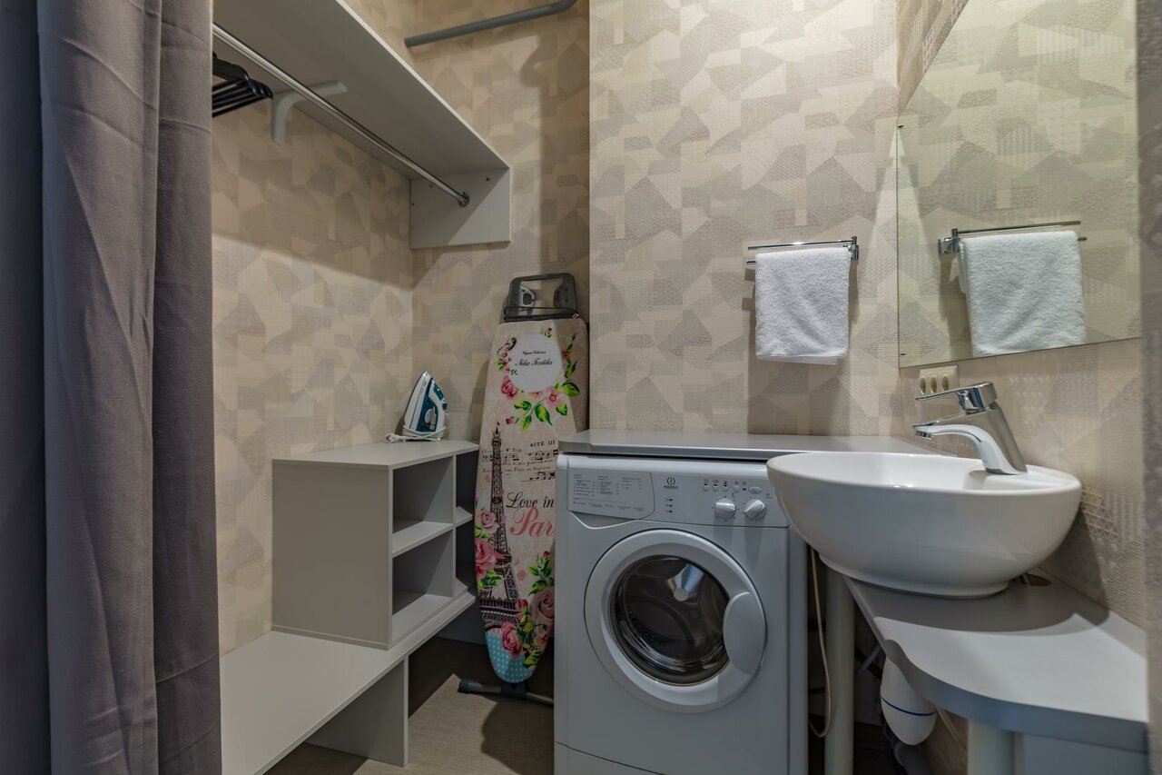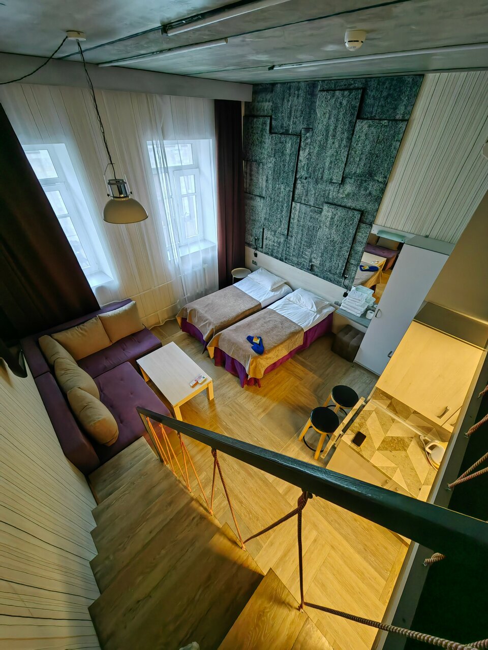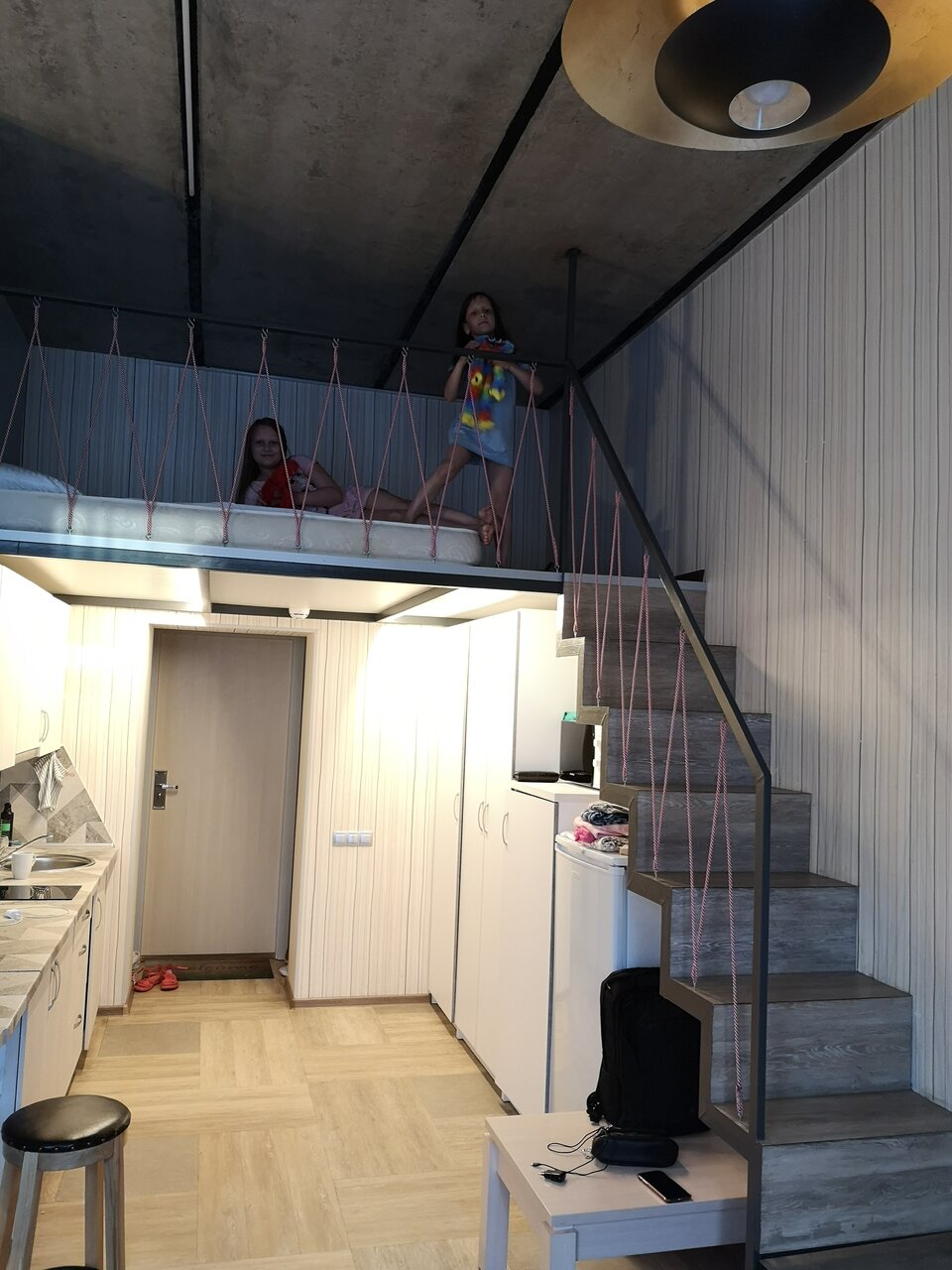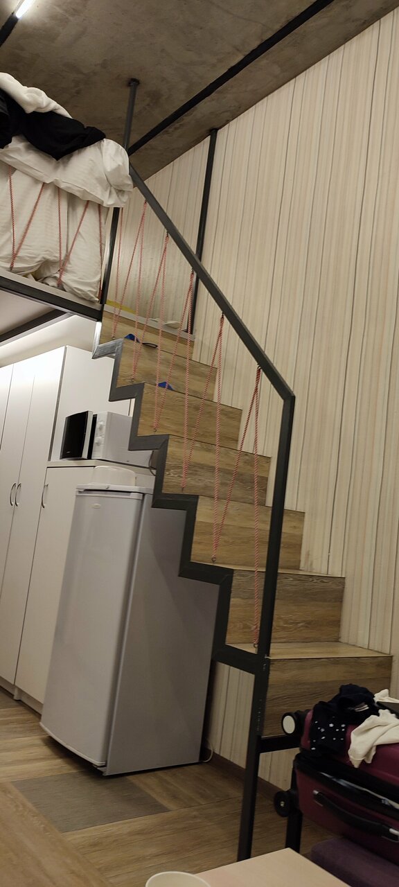 Отличный номер студия, все компактно и удобно. Совет: Связать дополнительные шнуры защиты второго яруса для безопасности маленьких детей (вдоль). И наклеить резиновые полоски на ступеньки. (Не дорого выйдет, а гостям приятно).