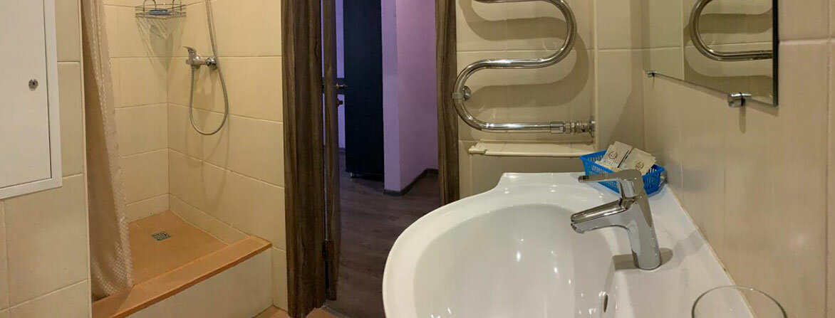 В нескольких номерах туалетные комнаты расположены отдельно. Нужно выходить из номера и переходить через коридор. Жесть