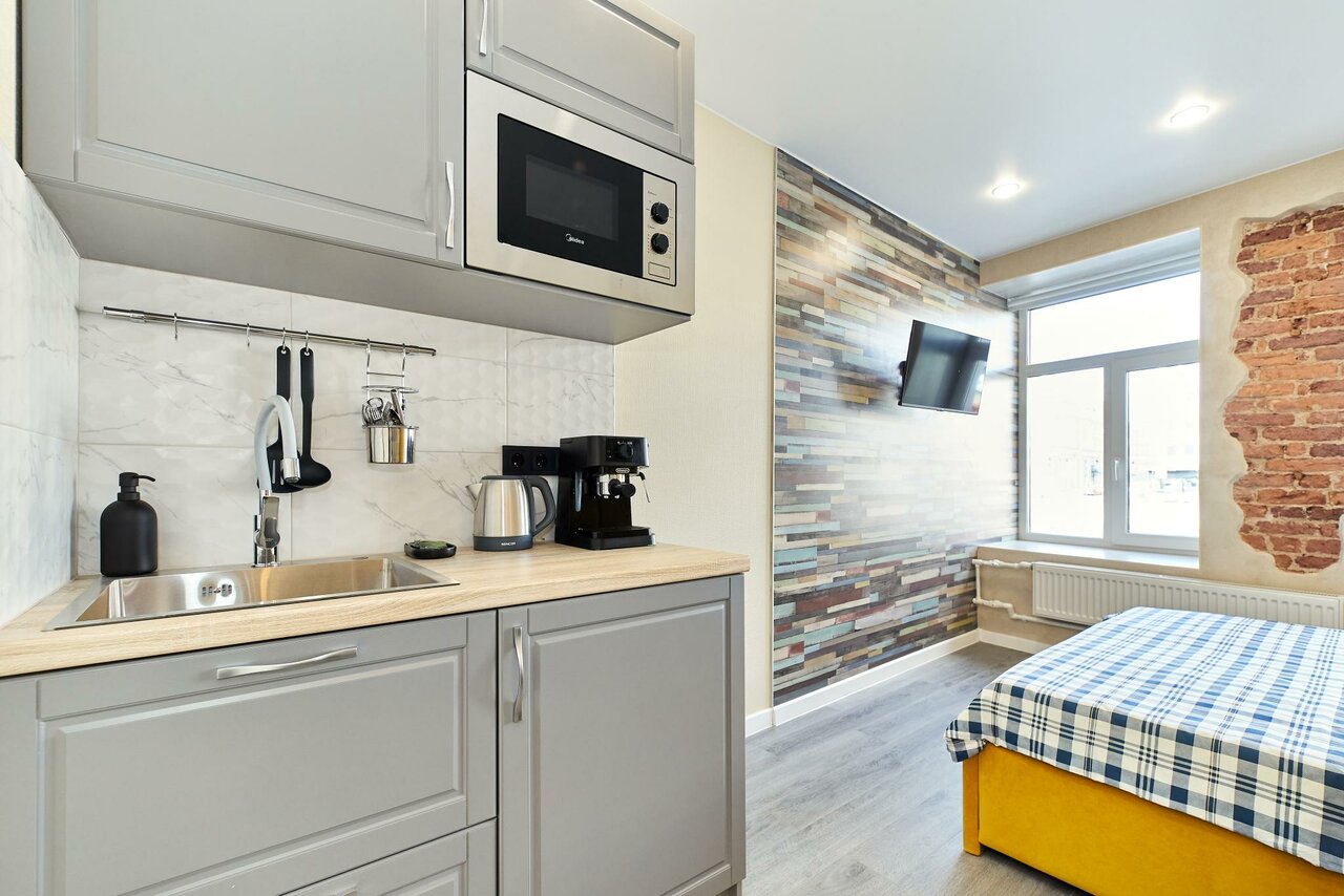 На месяцок приехали отдохнуть, нашли по этому адрессу хорошие однокомнатные студии под аренду, прачечная общая, вместе с сушилками. В номерах всё приятненьнько, чисто, не перегружено лишней мебелью, лаконичная и практичная расстановка в сочитании с ярким дизайном. Посуда парная, ничего лишнего. Но цокальный этаж, с окном перед дорогой — сами понимаете, какой уровень шума при желании проветрить помещение.