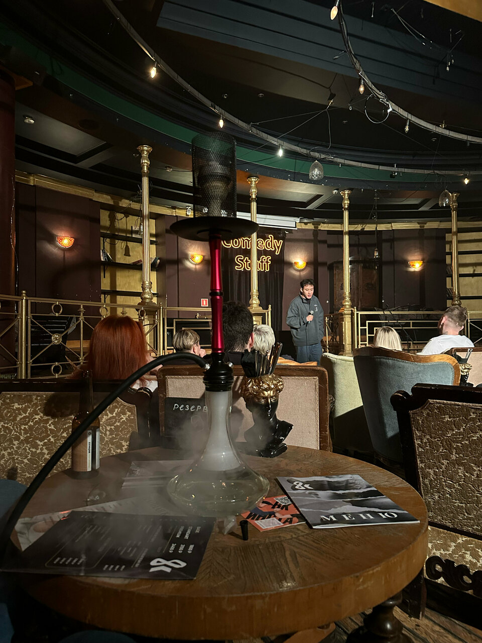 Место отличное! Атмосферно! Ходил 2 раза на стендап, вкусно ел и пилно вопросы к стендапурекомендую ведущему стендапа придумать несколько программ) Чтобы каждый раз не повторять отдго и то же! Чувак, ну поднажми))) Комики огонь! Кухня вкусно, напитки кайф! Кальян хороший)