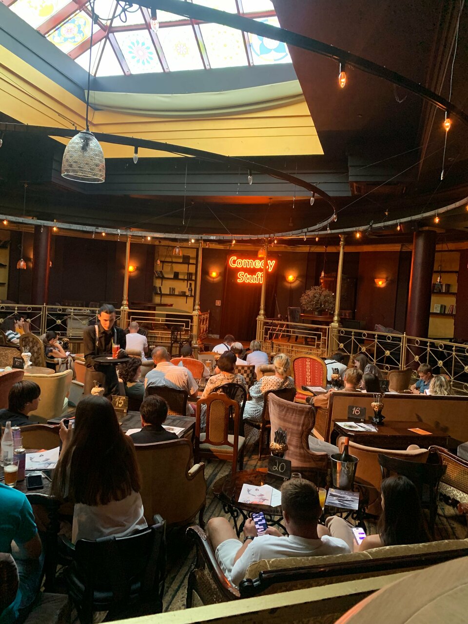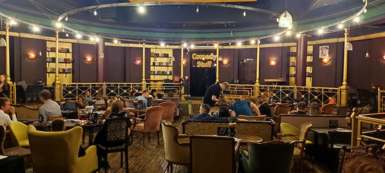 - Удобное место для компании.; Талантливые комики.; Очень качественный и смешной стендап.; Интересные мероприятия.; Необычный и интересный дизайн.