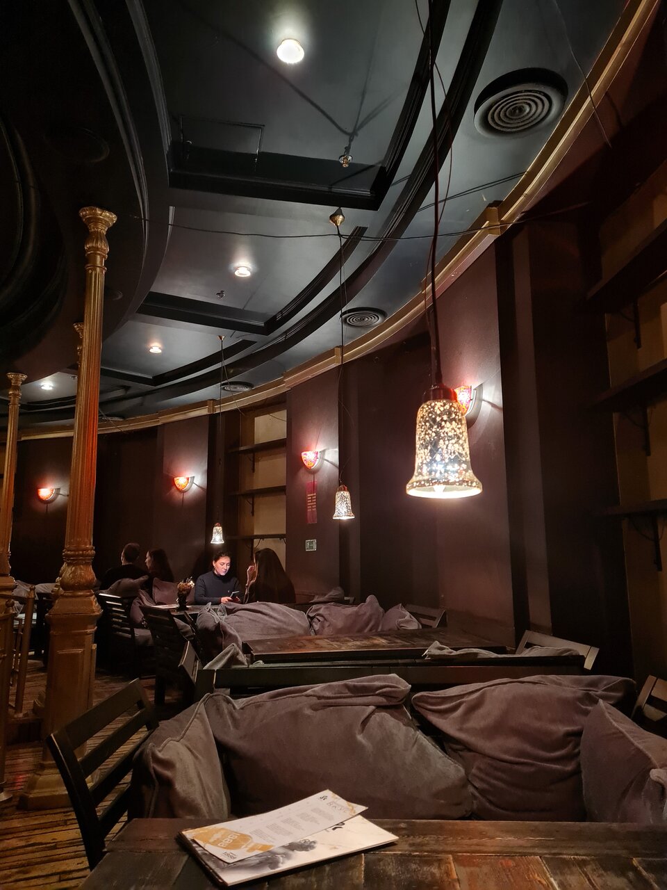 Старая мебель, вся в разводах. Кальянщик очень медленный и не разбирается в ассортименте. Купили билеты на стендап, искали данное заведение целый час.