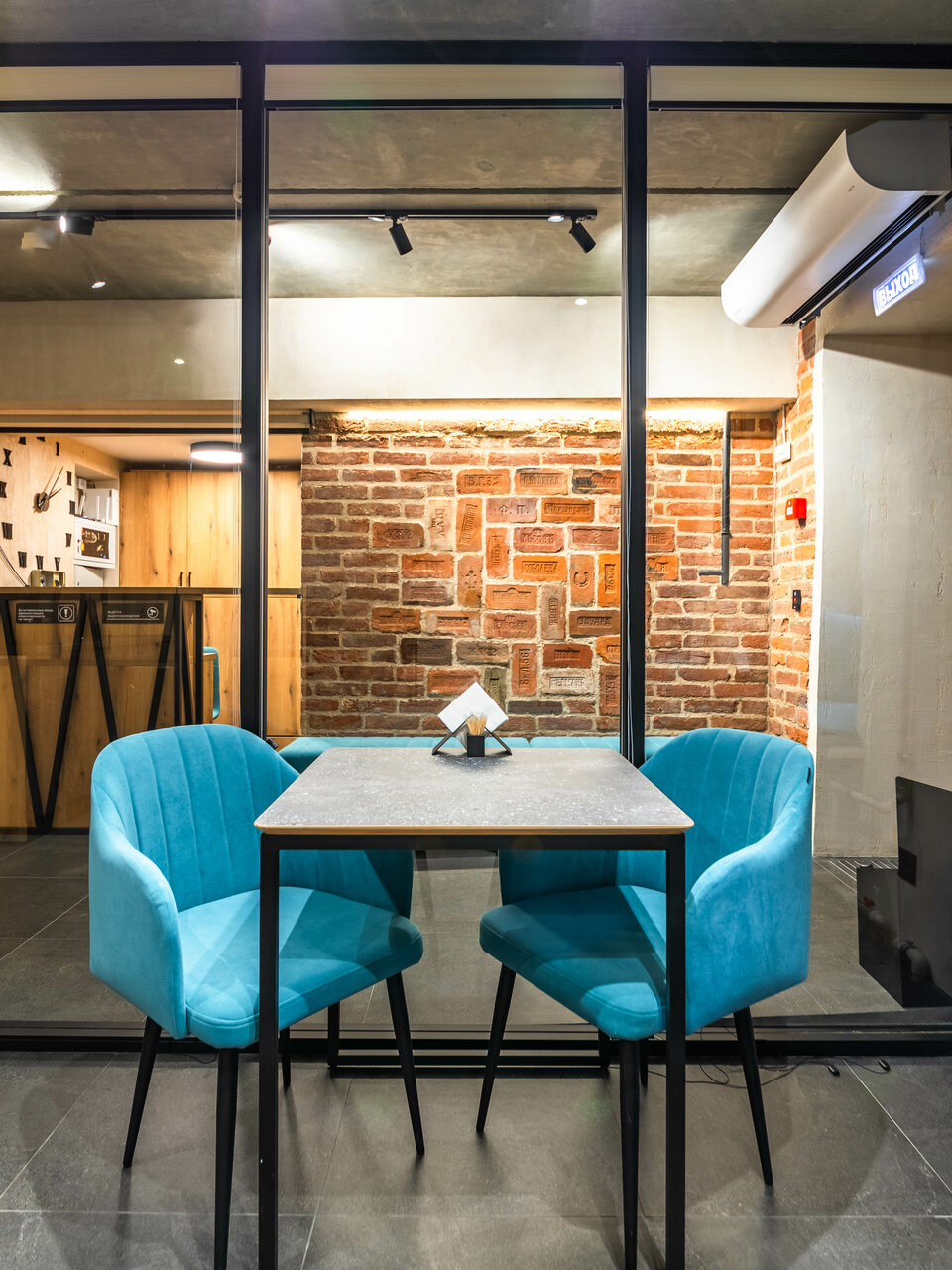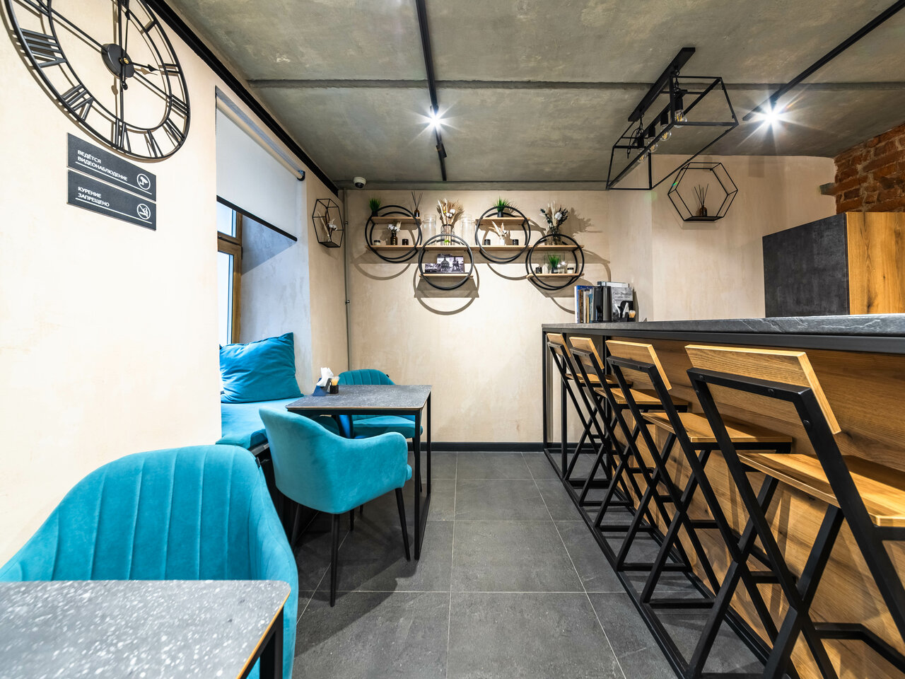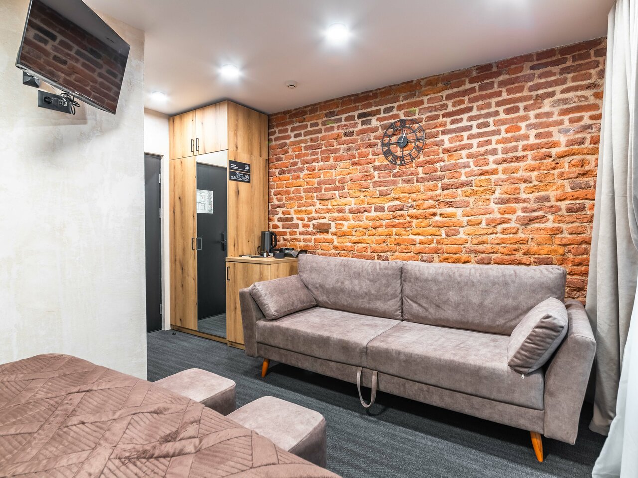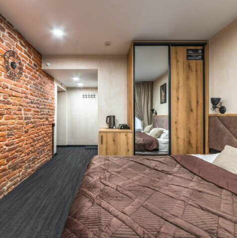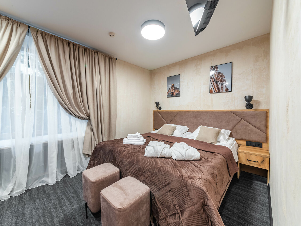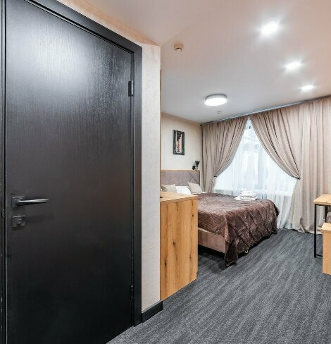 Двухместный номер с двуспальной кроватью, шкафом, столом и душем. В каждом номере есть набор предметов гостеприимства - по количеству основных мест. В отеле есть кафе, где каждый гость может выпить чашечку кофе или почитать книги о Санкт-Петербурге!