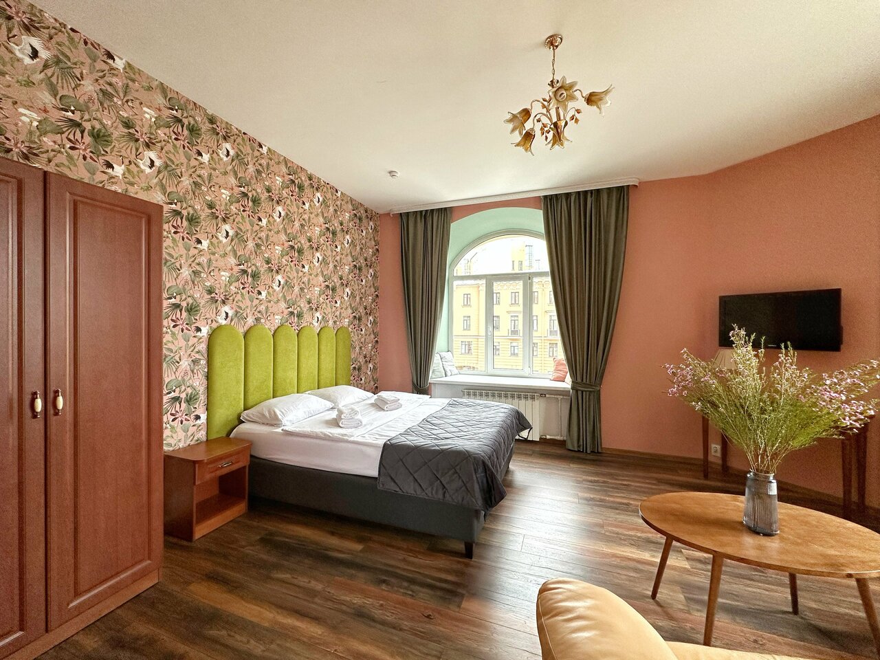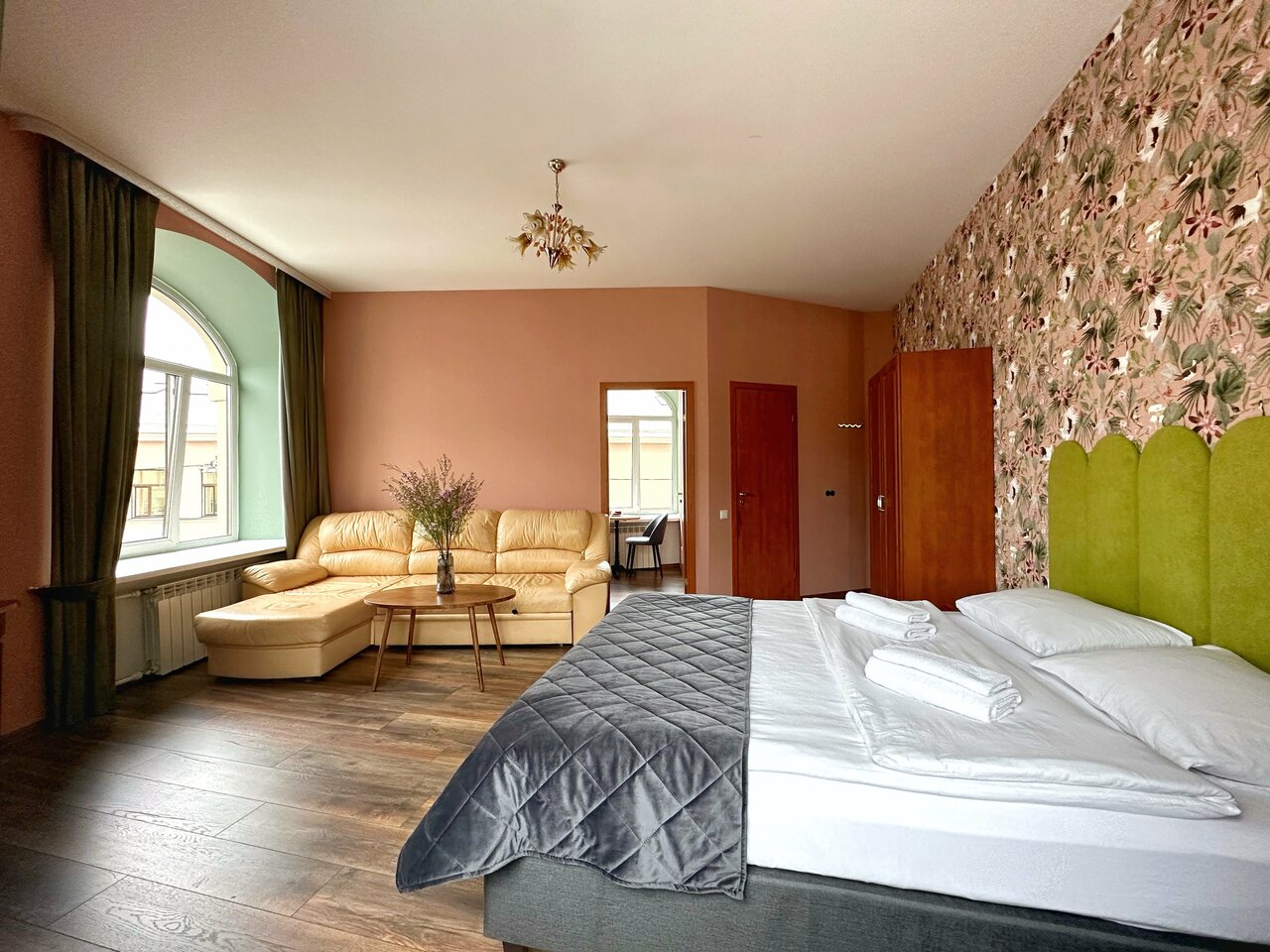 Двухкомнатный номер около 30 кв.м с видом на канал Грибоедова. Вместимость до 4-человек(2 взрослых и 2 ребенка, либо 3 взрослых).Комплектация номера-Мебель: двуспальная кровать, диван, обеденный стол, мягкие стулья, журнальный стол, шкаф, тумбоч...