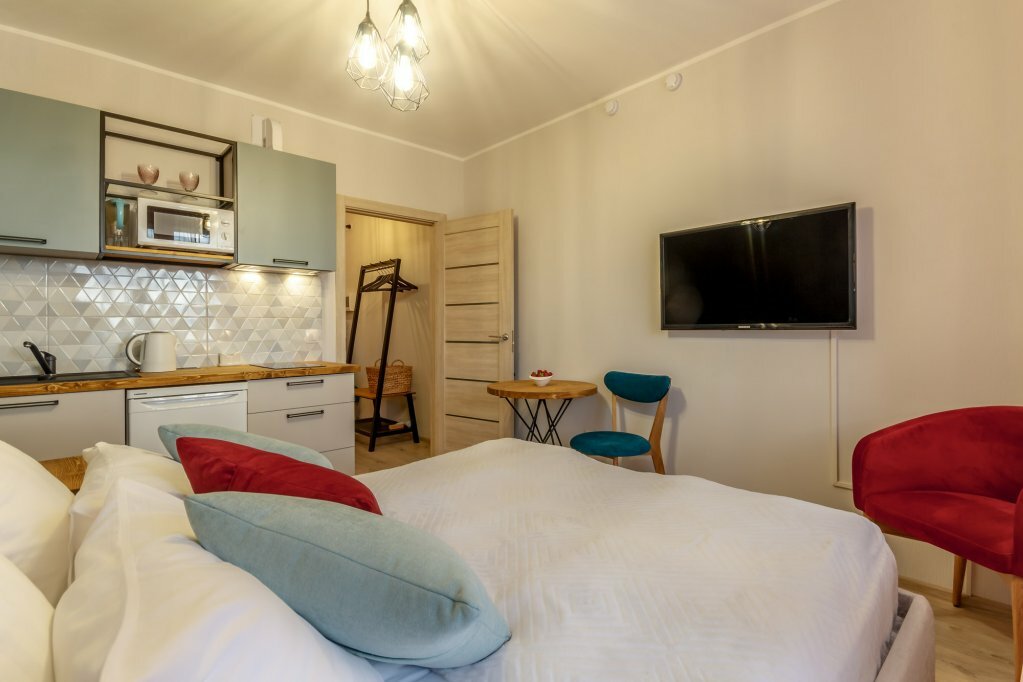 Комфортабельный однокомнатный номер, включает в себя спальню с двуспальной кроватью (200*200), рабочую зону, ванную комнату с душевой кабиной и косметическоими средствами, набор полотенец, халаты,тапочки. Техническое оснащение: Кондиционер, TV, холод