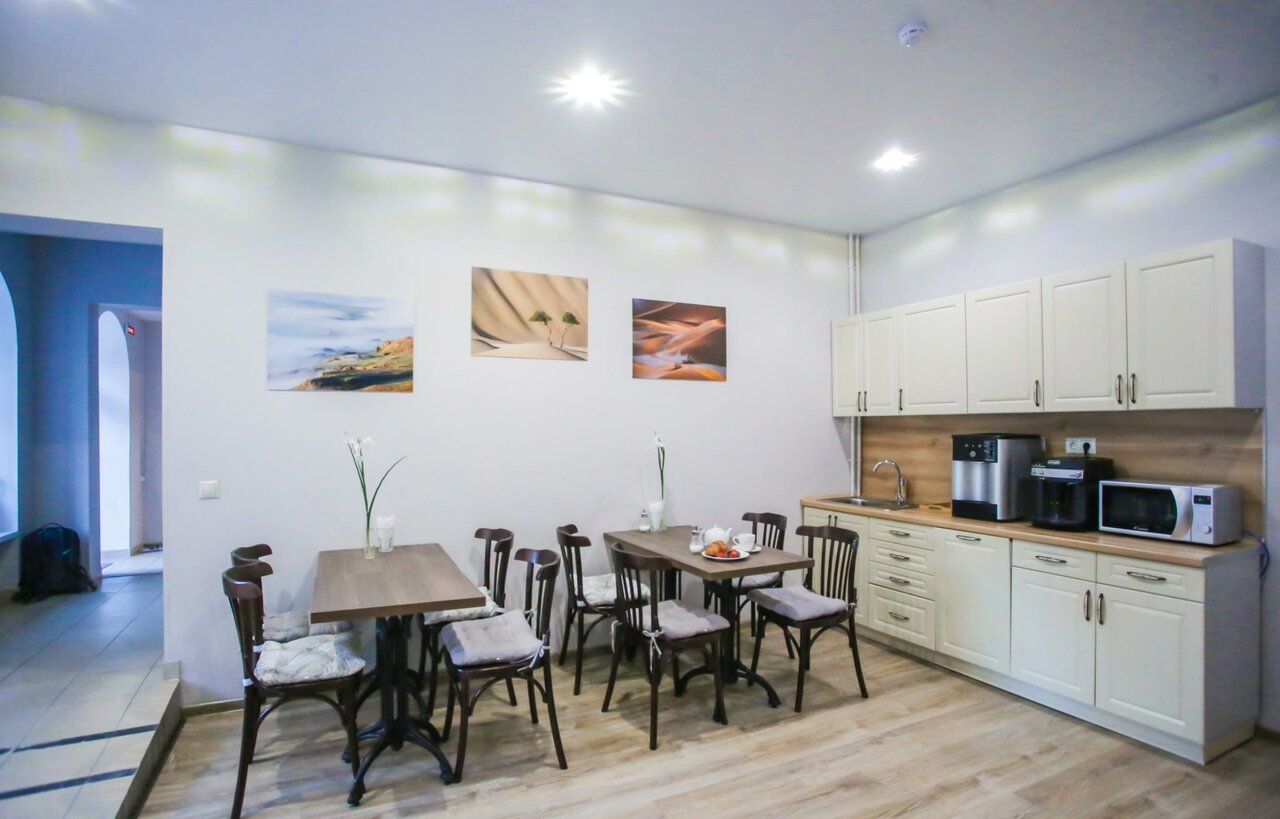 Расположение отличное — 10 мин спокойным шагом до Невского и метро. Номера чистые, убирают каждый день. Еда неособо разнообразная, но вкусная. Нешумно и уютно. В свободном распоряжении чай, кофе, общий холодильник.