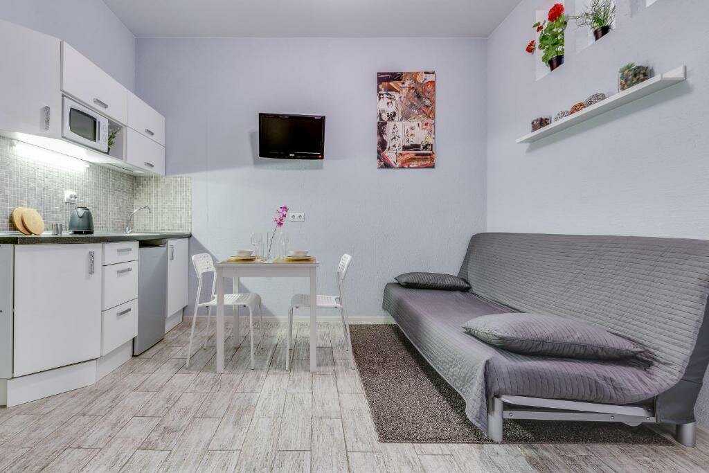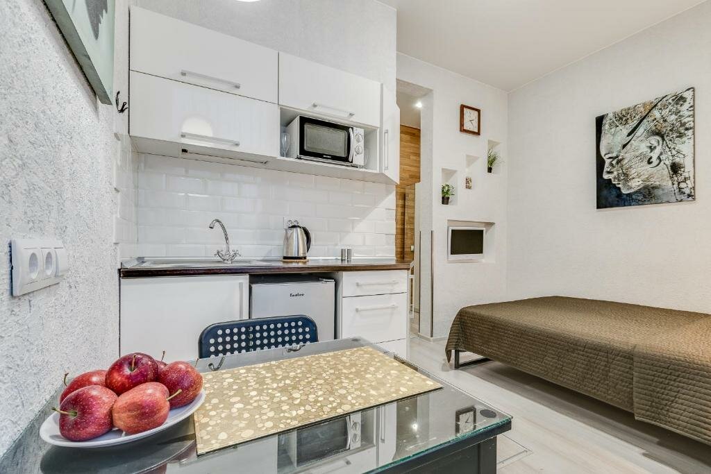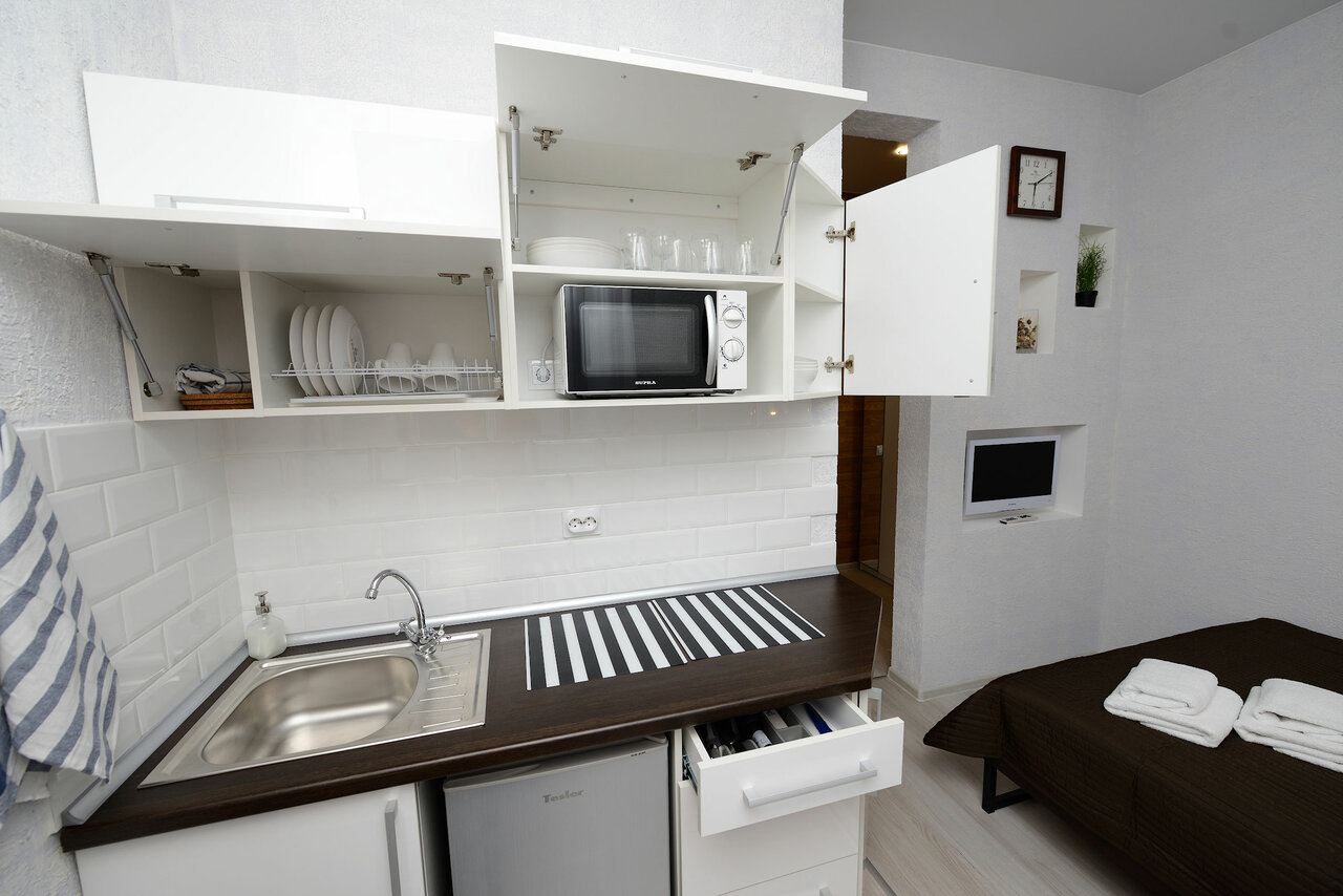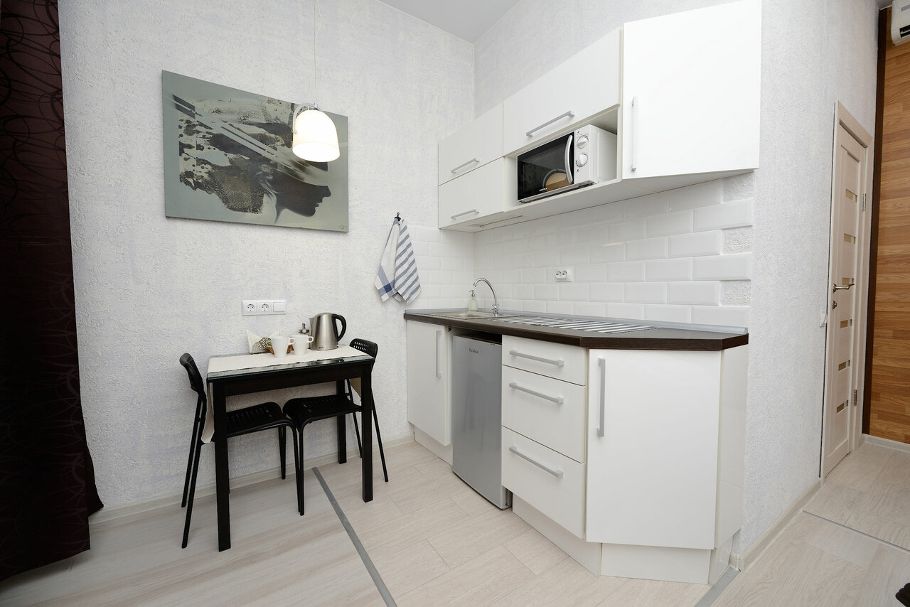 Здорово что в одной комнате всё есть, санузел, душ, плита, холодильник, имитация окна Правда двери хлипкие, межкомнатные. Но за эту цены мне кажется топчик