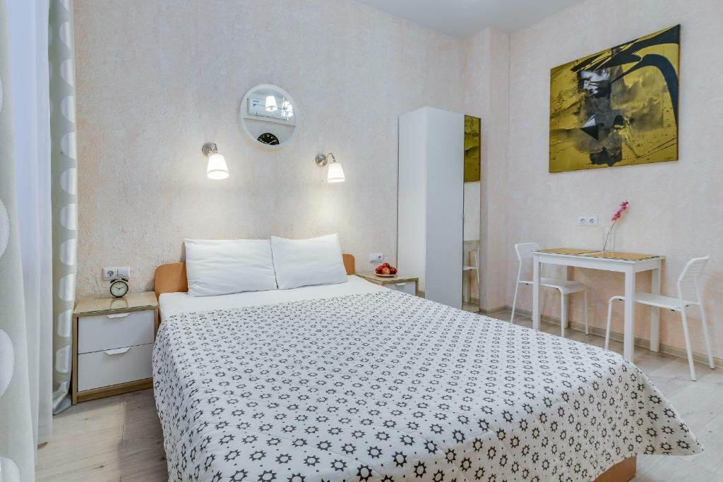 Уютный однокомнатный номер с удобствами. Номера этой категории оборудованы всем необходимым для сна, отдыха и работы: удобная, современная двуспальная кровать, прикроватные тумбочки, столик, стул, зеркало, шкаф, подставка под чемодан.