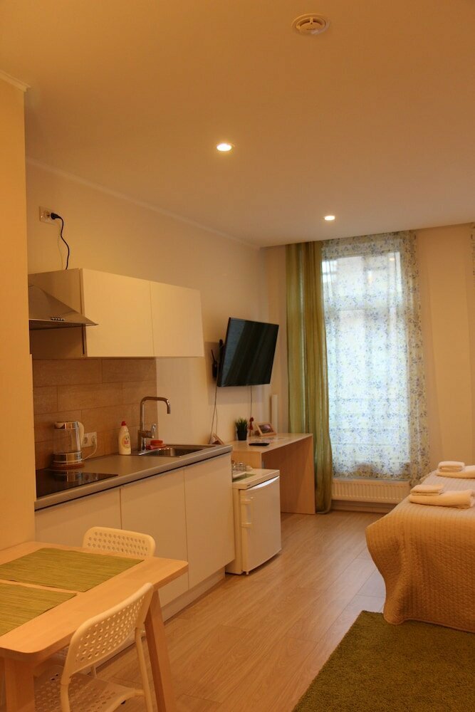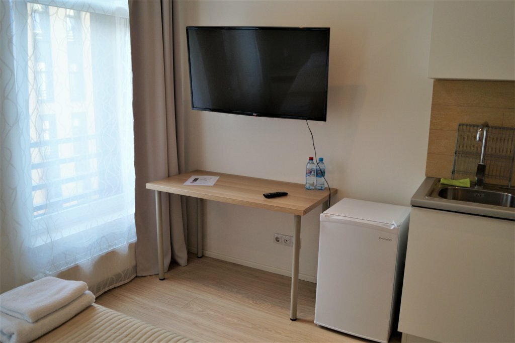 Вполне достойный апарт-отель. Достаточно просторная комната с небольшой кухней, маленьким холодильником, необходимой кухонной утварью. Есть стиральная машина, сушилка для белья под потолком в ванной, гладильная доска, утюг, фен. Также имеются одноразовые тапки, зубные щётки, шампунь в пакетиках, туалетная бумага. В целом чисто, постельное бельё и полотенца чистые. Только было неприятно видеть плесень по нижнему краю душевой кабины, и лично для меня кровать была слишком мягкой. В остальном всё хорошо. В комнате есть WiFi. Связь с менеджером по мобильному телефону, менеджер вежливая и доброжелательная. Вокруг апарт-отеля много ресторанов и кафе, рядом алкомаркеты, Окей, Перекрёсток. Ближайшая станция метро — Петроградская, до неё идти пешком минут 15-20.