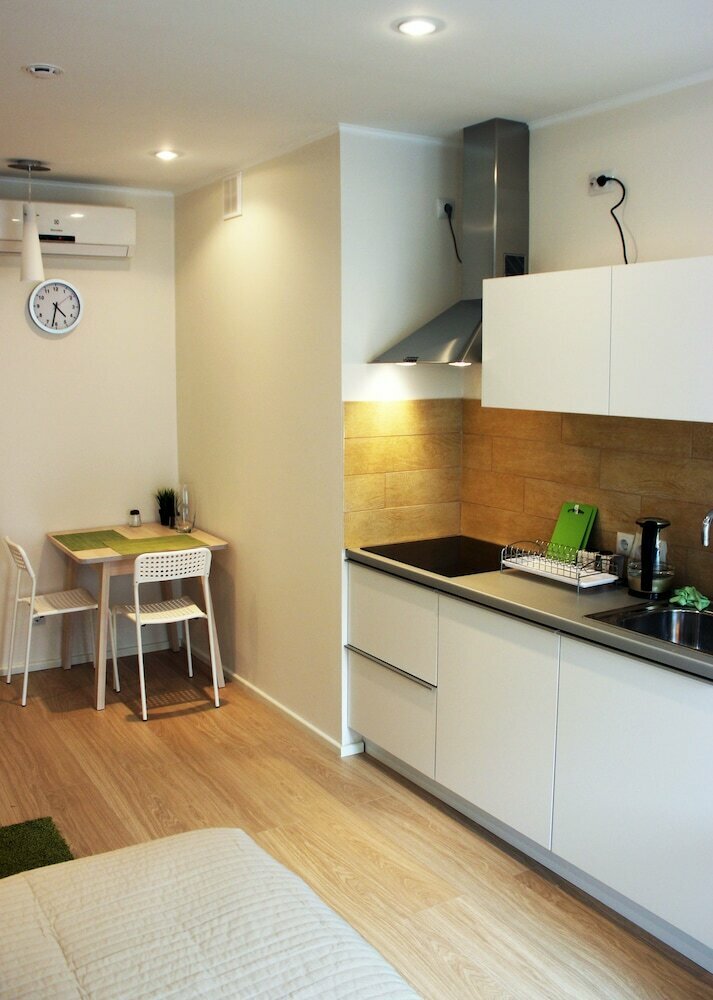 Остановились в гостинице на пару ночей. Номер чистый , уютный, мебель в стиле ИКЕА, Студия. Имеется все из посуды для приготовления еды. Микроволновка, плита, ложки , вилки, нож, тарелки сковорода, кастрюлька. Магазин Окей в шаговой доступности. Туалет чистый, раковина чистая, есть стиральная машина, Для вещей есть отдельное помещение со шкафом с полочками. Wi-Fi есть, тв есть. Проблем не было.