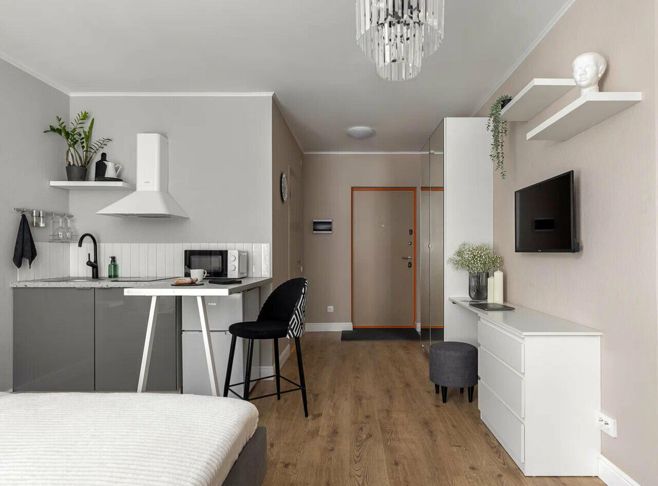 Очень чистая и уютная квартира студия. Есть все необходимое. Бесконтактное заселение. В подарок вкусняшки, чай, кофе, вода. Ребенок так же очень оценил)