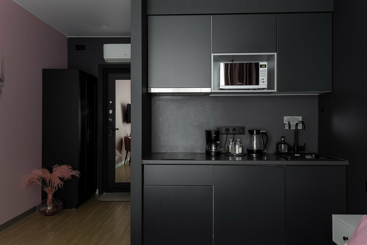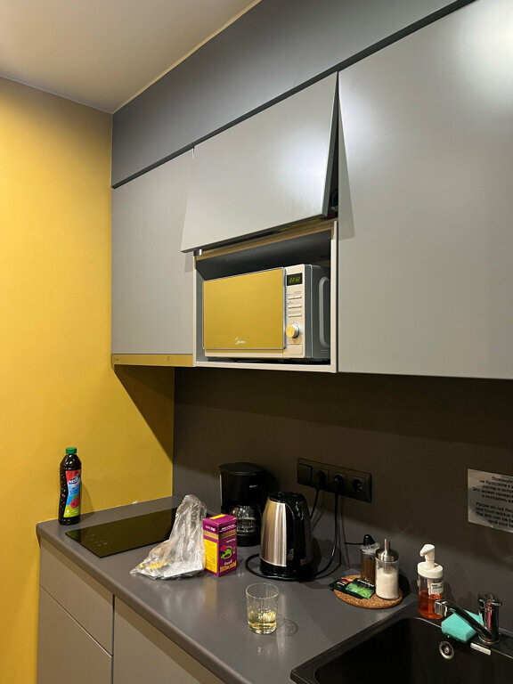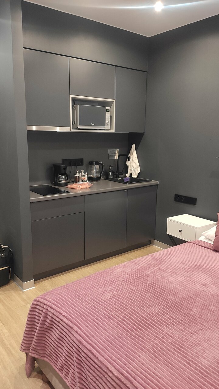 Хороший номер, всё что нужно для апартаментов есть, ложки, посуда, кастрюли и тд, отличный вариант если не хочется много тратится на еду, а можно готовить самому, особенно если снимаете на длительный срок, сам лично поэтому выбираю апартаменты. Также без проблем можно постирать вещи, в общей зоне есть стиральная машина, сушилка, гладильная доска и тд.