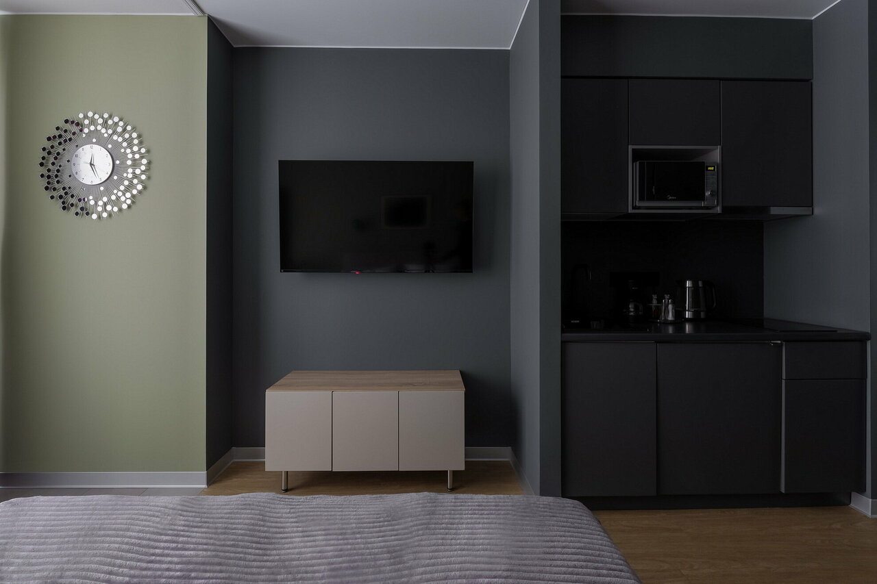 Отличные аппартаменты, уютно, чисто и комфортно для проживания) есть кухонная зона, небольшой холодильник, чай кофе, вся посуда. Стиральная машинка. Нам очень понравилось у вас)