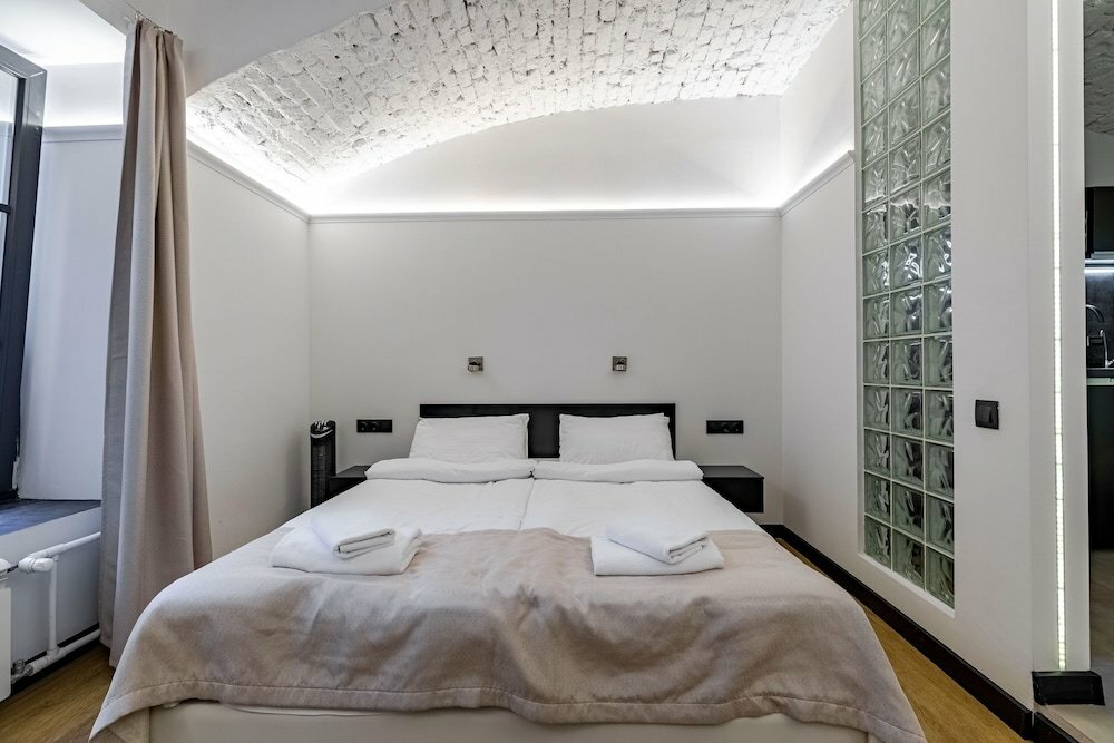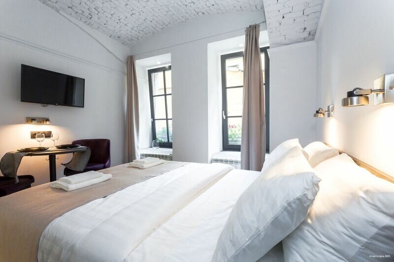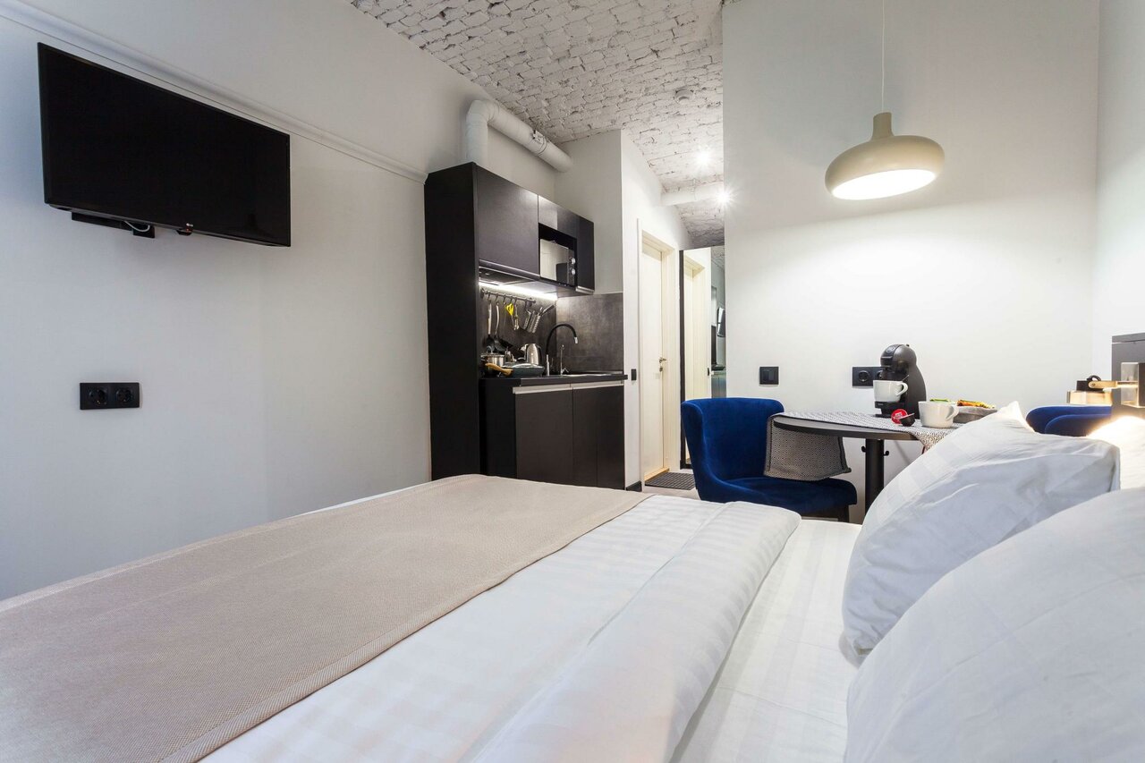 Отель располагается на первом этаже жилого дома. Мы жили в апартамантах #1. Комната маленькая, но все необходимое есть (кухня, стиральная машина, гладильная дгска с утюгом и тп). В номере чисто, нет посторонних запахов. Единственный минус — шумоизоляции от общего холла никакой и окно приходилось все время держать с опущенными шторами — первый этаж и вас видно всем проходящим мимо. Но зато отличное расположение отеля — 5 мин пешком до Эрмитажа. В целом отель рекомендую.