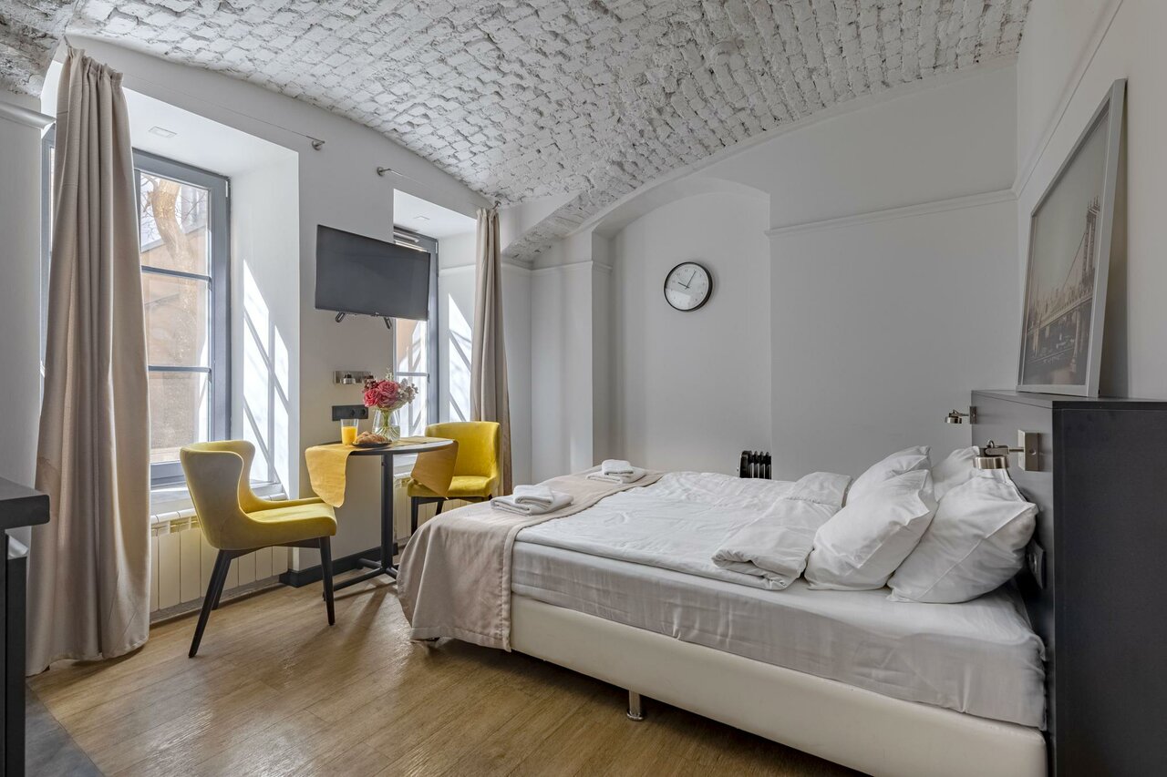 Удобное расположение, всё близко, с удовольствием погуляли по набережной, сходили до Собора Казанской Божьей Матери, в Эрмитаж. В номере есть всё , что нужно-убобная двухспальная кровать, душ, посуда, мыльные принадлежности, тапочки и для дождливого Питера даже 2 зонта. В номере чисто, уютно, есть кондиционер, можно проветривать, т. к. окна выходят в спокойный двор, есть обогреватель. Каждый день были кофе и чай. Есть капсульная кофемашина и электроплита. Было всё уютно и удобно как дома.