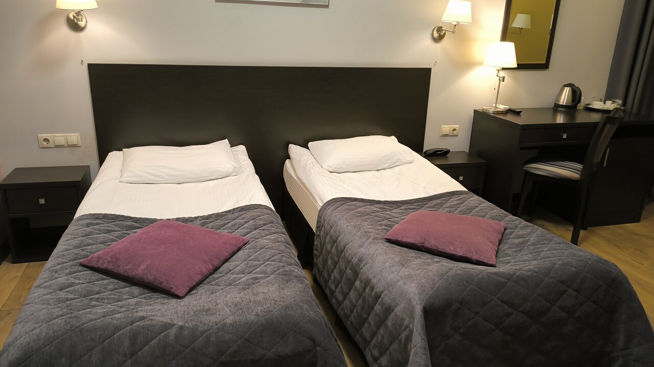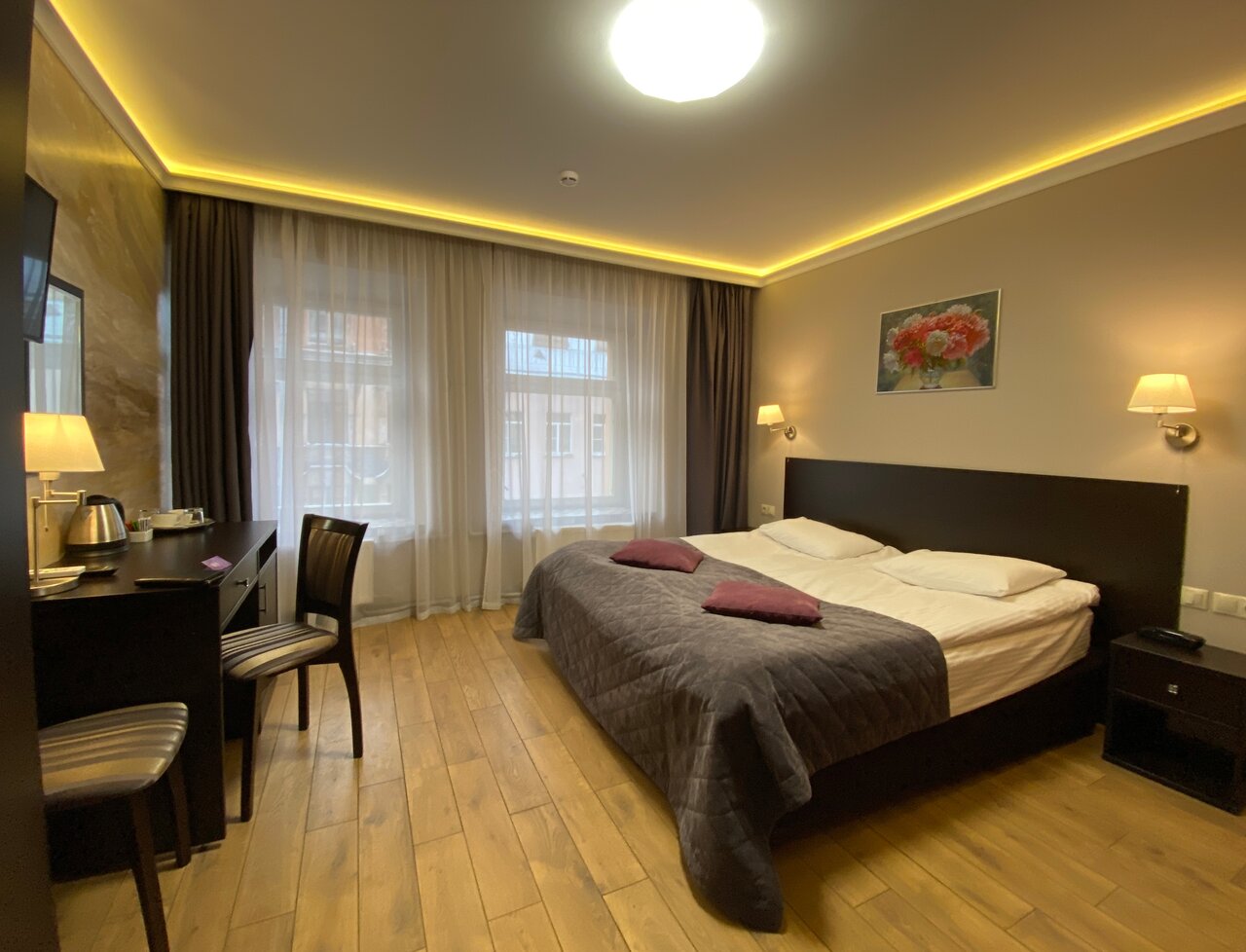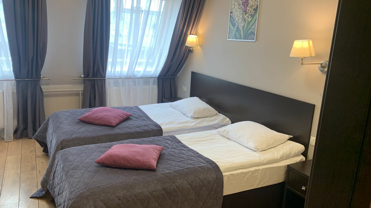 Просторный двухместный однокомнатный номер площадью от 16 кв.м. с одной двуспальной или двумя односпальными кроватями. Вид из окон на тихую улицу или во двор.