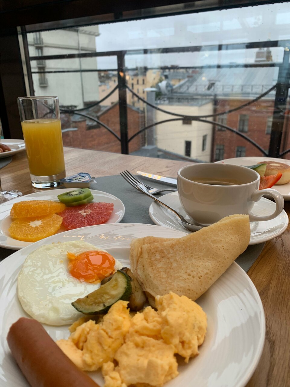 Отдыхали с 20 по 23 июля с женой. Потрясающий отель, очень чисто, красиво. Обязательно вернусь. Плюсы: Буквально через дорогу Эрмитаж. В номере есть все необходимое, плюс к этому еще кофеварка (капсулы меняют каждый день), набор для бритья, мини бар бесплатный с первого пополнения. Бассейн и сауну не успел проверить, но, думаю, и там все прекрасно. Минусы: Высокая цена завтраков формата шведский стол. 1700 рублей — это очень много. Можно позавтракать платно за 800-1000 в ресторане при отеле, либо сходить в заведения рядом. В 5 минутах как минимум 2 места хороших с завтраками.