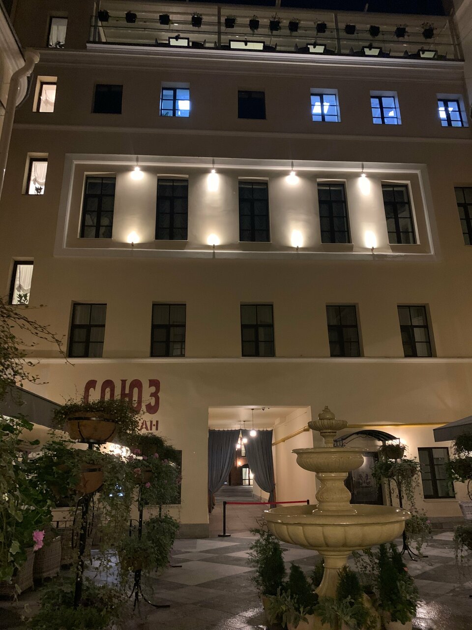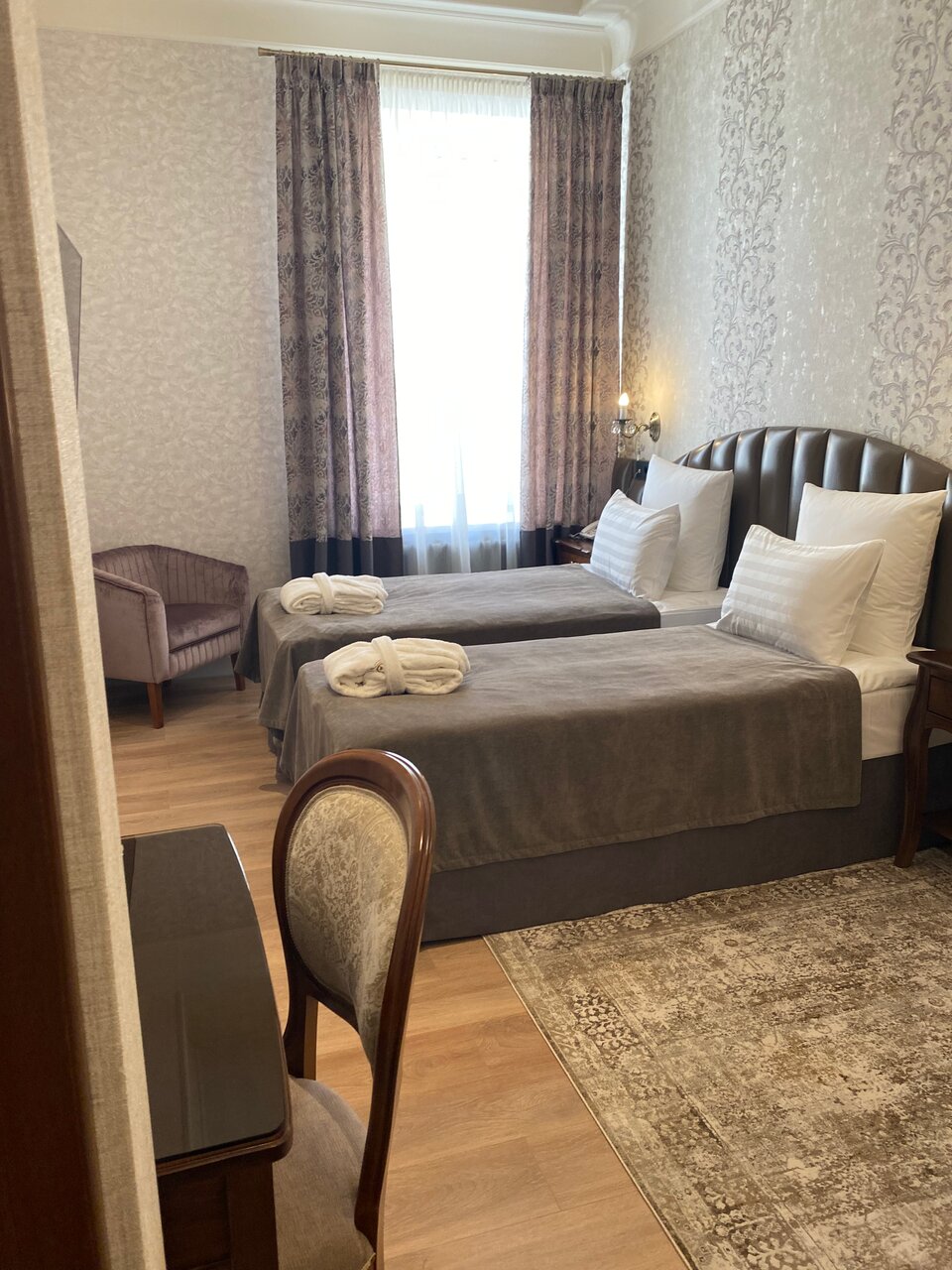 Обслуживание в номерах отличное. Расположение очень удобное, недалеко от Зимнего дворца. Персонал вежливый, учтивый. Номера чистые, с высокими потолками. Чистота радует глаз, что в коридорах, что и в номерах . Еда в ‘Союзе’ разнообразная, изысканная, с шомпанским на завтраке.