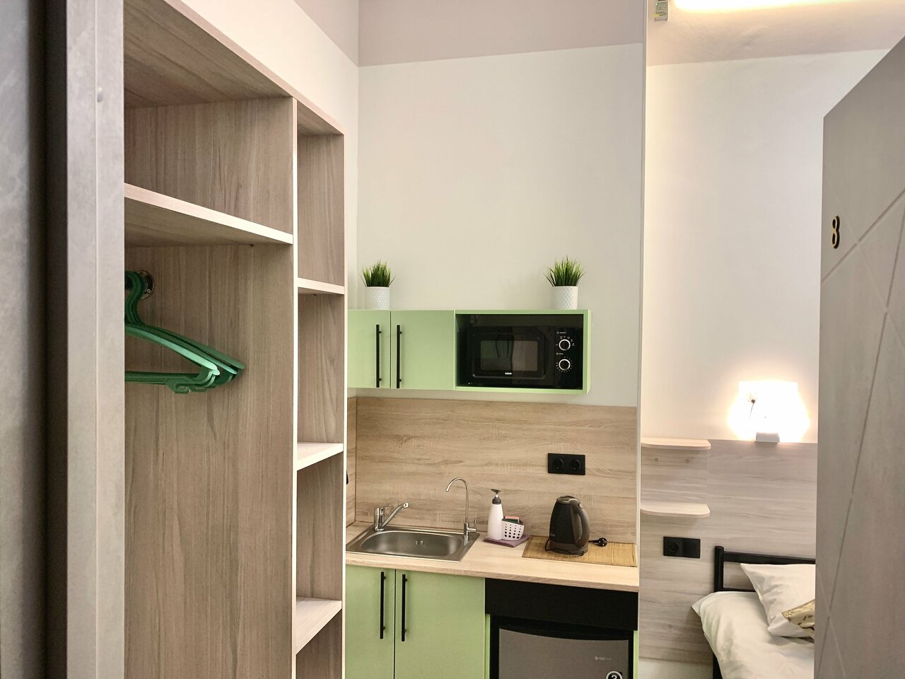Останавливались здесь на несколько дней, и остались только положительные впечатления. Номер компактный, но уютный, с удобной кроватью и чистым постельным бельем. Особенно понравилось, что для гостей были предоставлены свежие полотенца. Кухонная зона очень продуманная: есть микроволновка, чайник и небольшой холодильник, что делает пребывание еще удобнее. Все чисто, аккуратно и выглядит современно. Ванная комната – просторная и стильная, с качественным ремонтом. Душ работает отлично, есть фен, а также место для размещения личных вещей. Отель находится в удобном месте, недалеко от центра города, с хорошей транспортной доступностью. Обязательно вернемся сюда при следующем визите. Рекомендую всем!