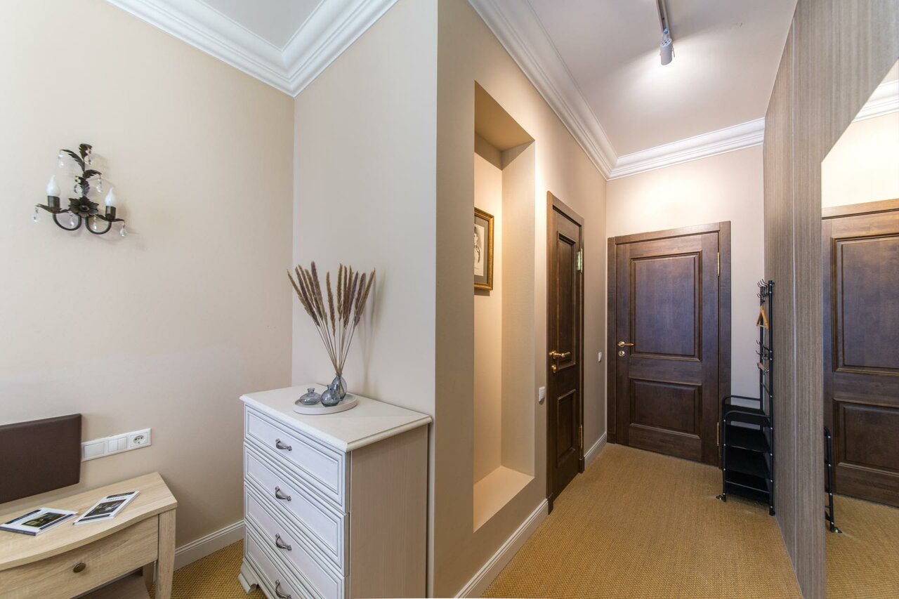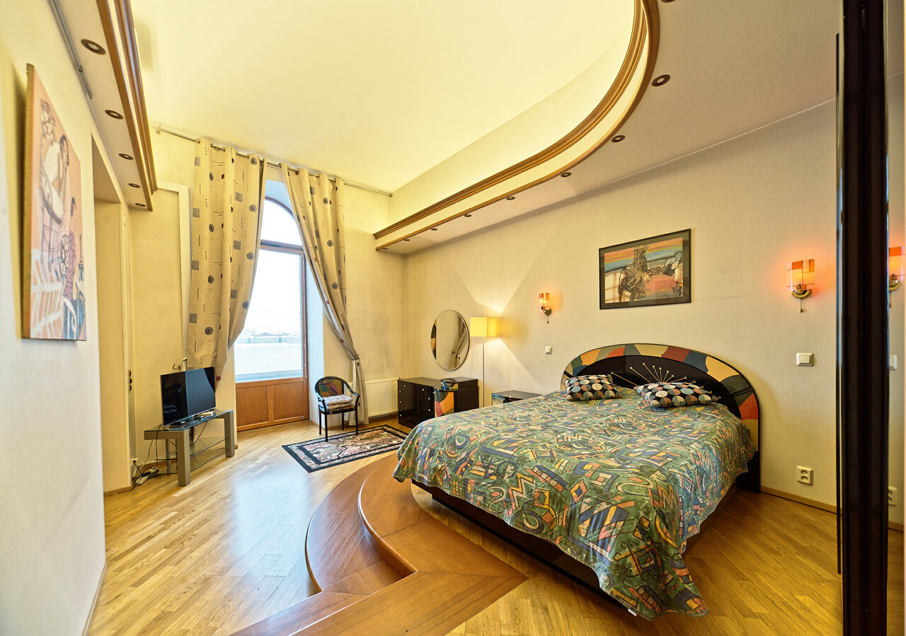 Запасной дворец князя Владимира Александровича (основной дворец — следующее по Миллионной здание, ныне дом ученых). До атлантов и Эрмитажа буквально метров 300. Бываем там с 2018 года, еще через другие, ныне покинувшие страну сервисы. Огромная квартира с 6 метровыми потолками, панорамными окнами и даже балконом (а их всего три на весь дом — абы кому не выдают). Есть все, что нужно — 2 санузла (с нашими многочисленными детьми весьма немаловажный фактор), стиральная машина, посудомойка и всех детей можно распихать в отдельные спальные комнаты в разные углы квартиры. Очень тихо и тепло зимой. Замёрзнете в городе в ненастье, — отогреетесь в финской сауне и джакузи. Ну и главное — окна на набережную и вид на Петропавловку, а ночью — любуйтесь на мосты, не выходя из дому). Если приедете в июле — военно-морской парад будет прямо перед Вами. Внимательная хозяйка встретит, поможет разобраться и чувствовать себя по домашнему. Все интеллигентно.