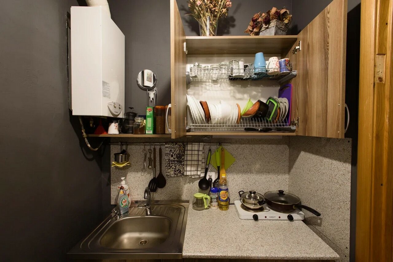 - Мини-кухня с необходимой техникой и продуктами.