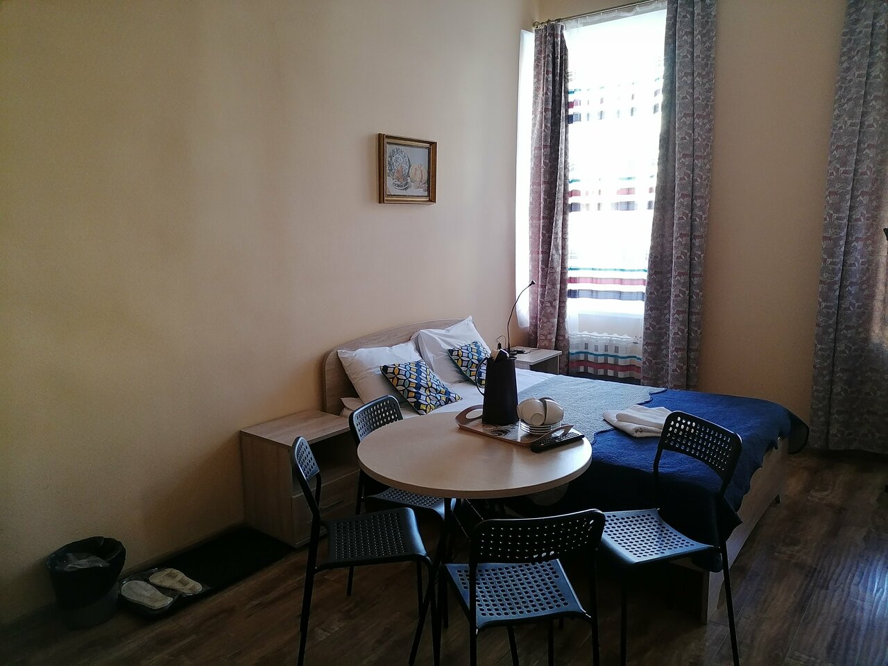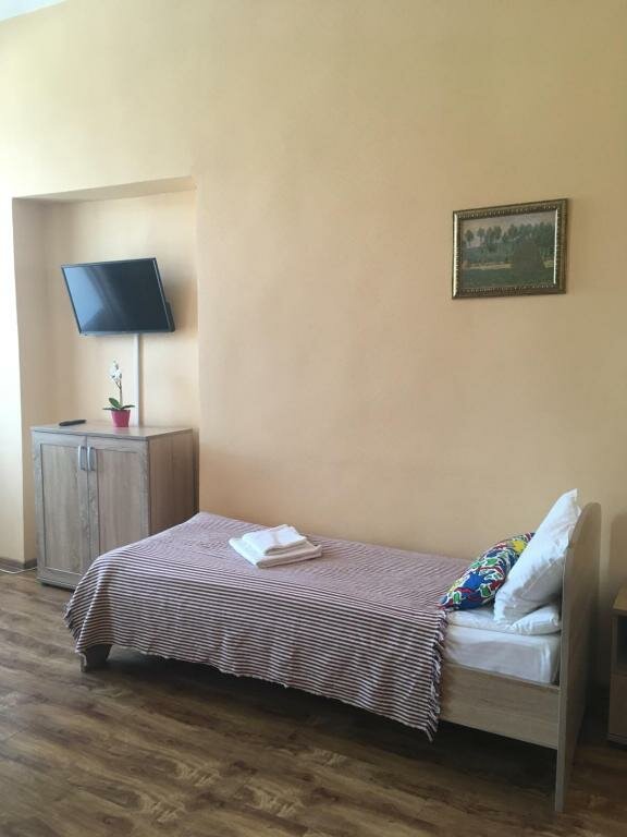 Очень хорошее расположение, номера чистые, обслуживание хорошее, есть завтрак (хлеб, сыр или колбаса или паштет, йогурт, масло сливочное и павидло, чай, сах и кофе. В номере есть телевизор, кружка. Чайник на кухне в номер брать не разрешают. Один минус, это полное отстутствие шумоизоляции, стен как буд то нет и эхо разносилось по этажу как в колодце, хорошо соседи попались хорошие, все разговаривали шепотом, вставали и спать ложились синхронно если спите крепко, то все отлично!