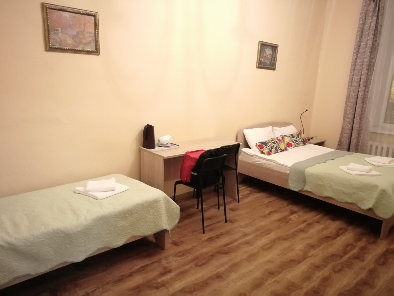 Были в этом отеле с 30 октября по 4 ноября 2018 года. Плюсы-цена проживания, месторасположение (практически центр города,до эрмитажа и других крупных исторических мест 15-20 минут пешком. От ближайшей станции метро вообще 5-7 минут) .Чисто в номерах и в целом в гостинице. Не смотря на небольшое колличество туалетных и душевых,очередей не видел. Были небольшие проблемы с горячей водой,но это от не знания как пользоваться водогрейной колонкой. Потом всё наладилось. Хороший завтрак. Минусы-вид из окна(но это не зависит от отельера) . В душевых ( при наличии большого колличества брюнеток ) на полу было много волос. Плохо уходила вода в душевой,возле отдельного туалета. Пожелания- добавить освещения в кухне. Не плохо было-бы иметь чайники в номере.Не удобное размещение телевизора. И мало розеток в комнате(чтоб зарядить гаджеты). Не смотря на минусы отель буду рекомендовать друзьям и если сутьба приведёт в Питер ещё раз ,обязательно буду рассматривать и этот отель.