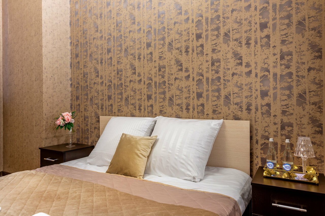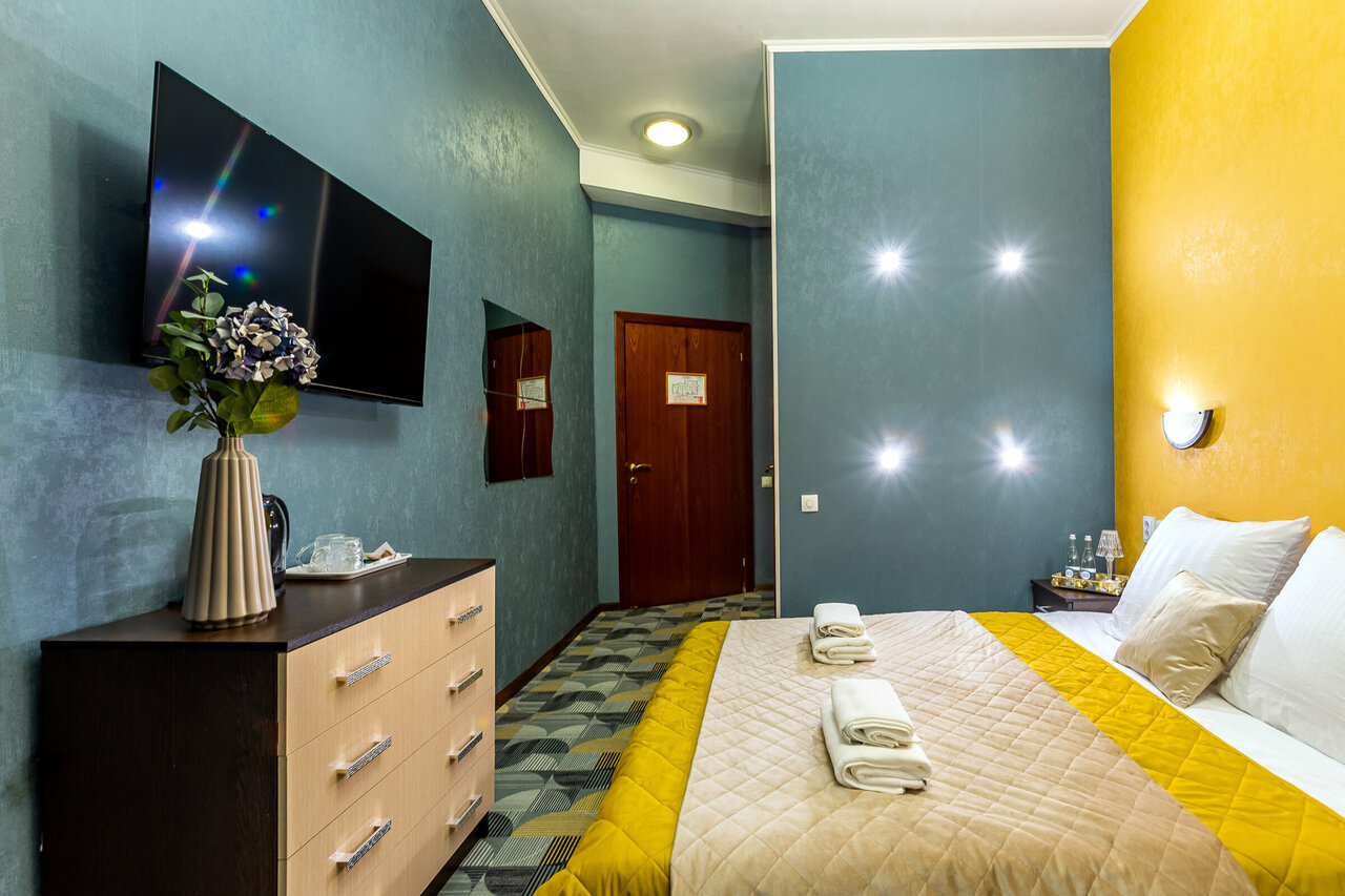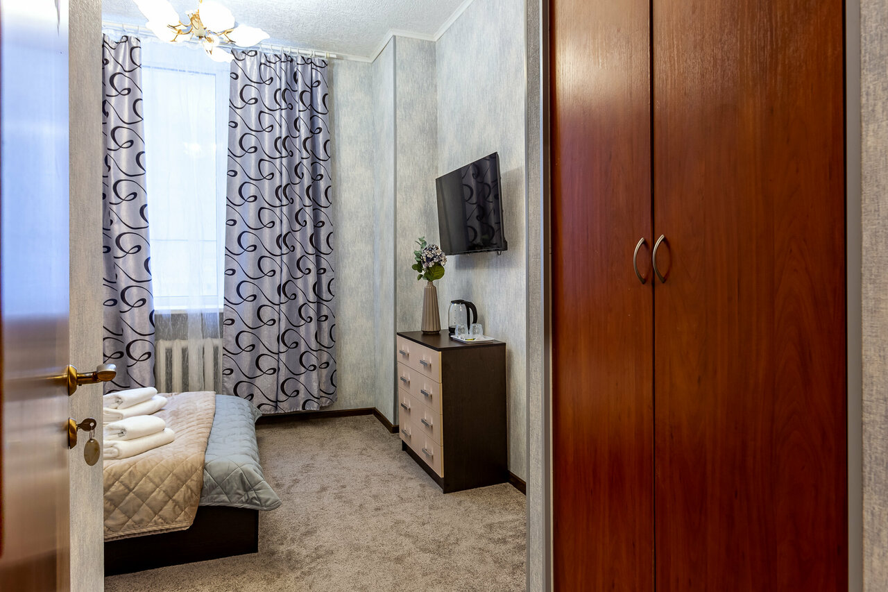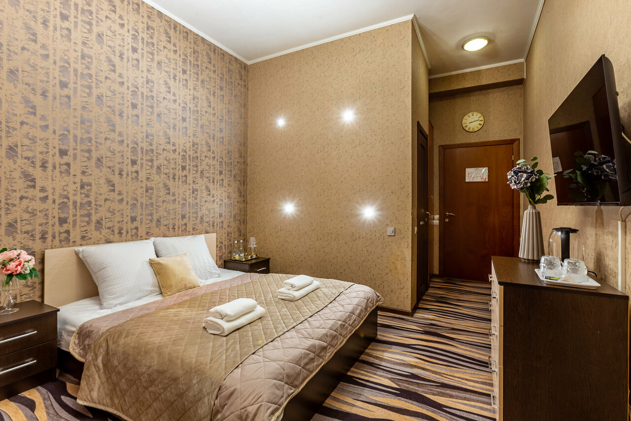 Номер с санузлом 17м2, кровать 180*200, раскладное кресло, телевизор 42', кондиционер, холодильник, чайник, кофемашина, фен, тапочки, халаты. Ежедневная смена полотенец, обновление чайного набора, одноразовой косметики.