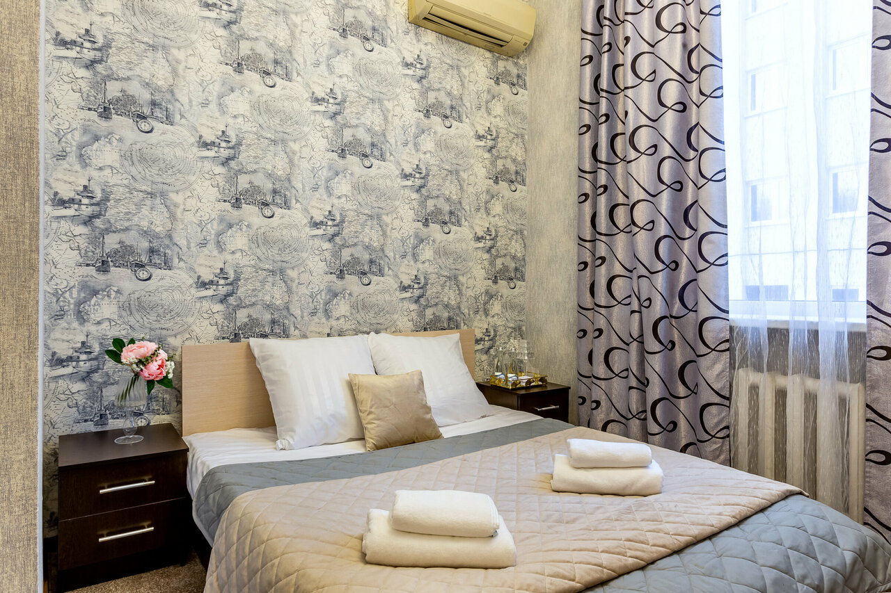 Номер с санузлом 15м2, или одна кровать 180*200, или 2 кровати 90*200 телевизор 42', кондиционер, холодильник, чайник, кофемашина, фен, тапочки, халаты. Ежедневная смена полотенец, обновление чайного набора, одноразовой косметики.