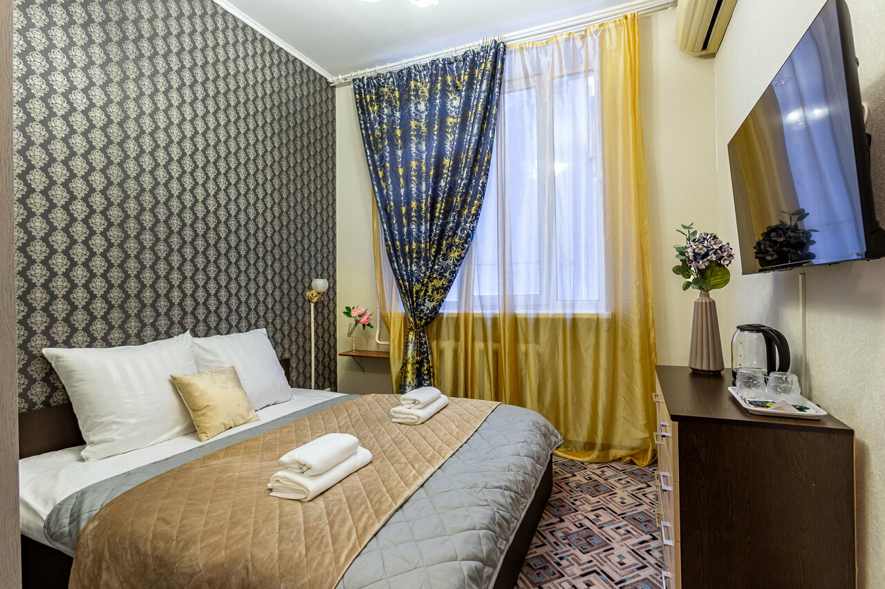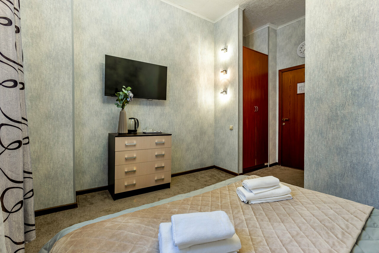 Номер с санузлом 12м2, кровать 140*190, телевизор 39', кондиционер, холодильник, чайник, фен, тапочки, халаты. Ежедневная смена полотенец, обновление чайного набора, одноразовой косметики.