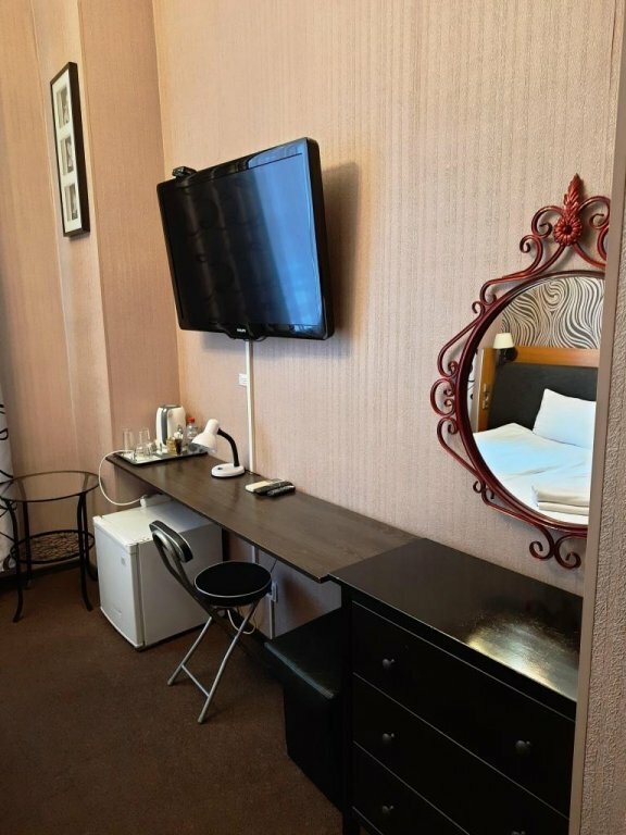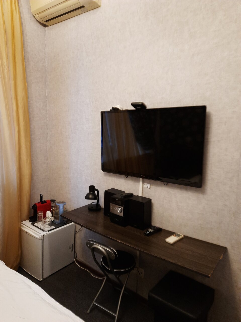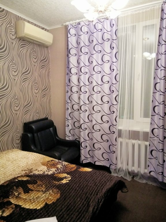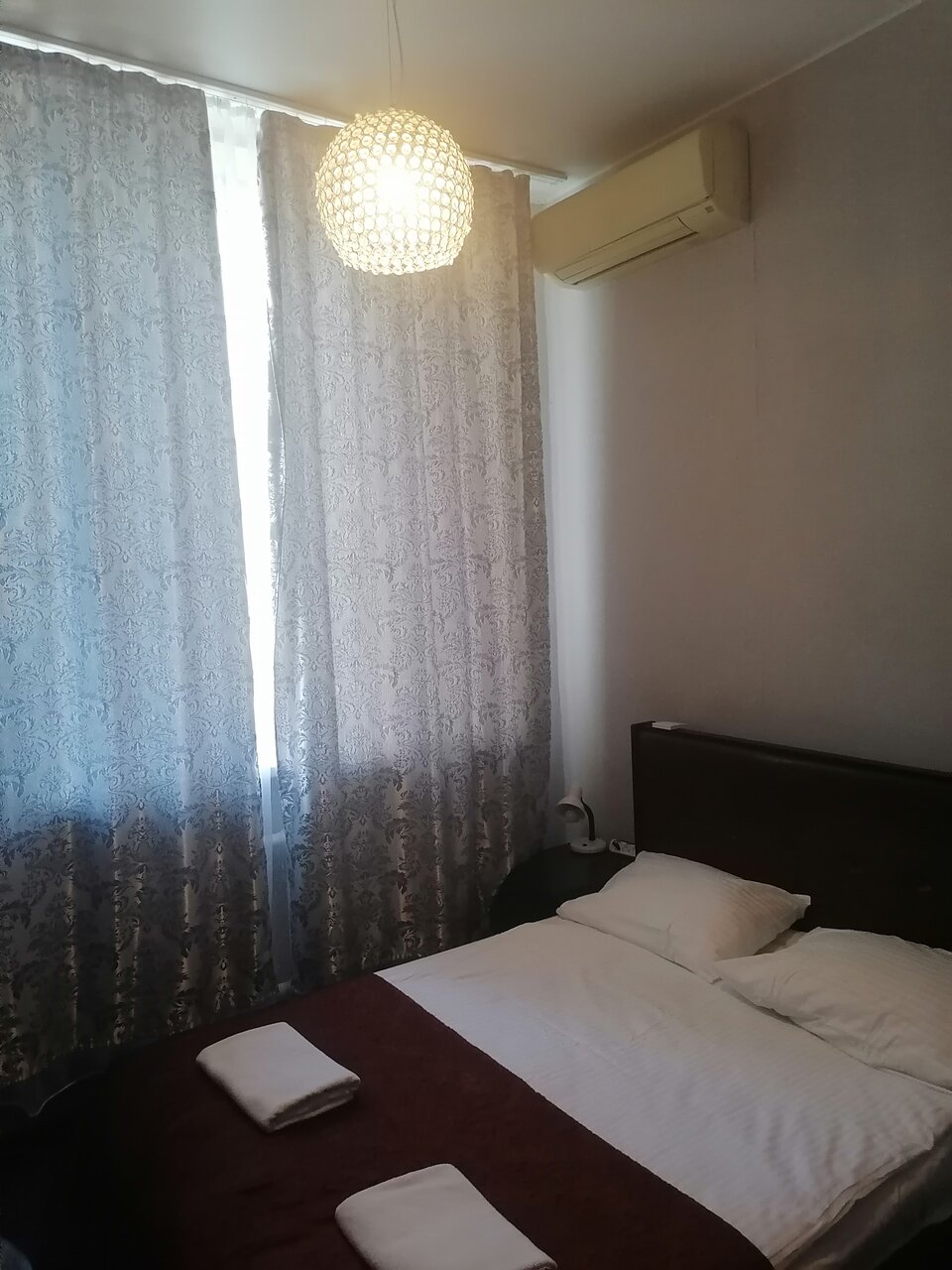 Небольшой отель на первом этаже жилого дома. Производит неприятное впечатление. Серые стены, полотенца старые, ощущение что стиранные, но по хорошему можно использовать для тряпок. Покрывала на кровати в пятна, вторая кровать была не застрелена Постельное белье синтетических неприятное на ощупь, стола нет, Из плюсов в коридоре микроволновка, посуда, есть баллон с питьевой водой.