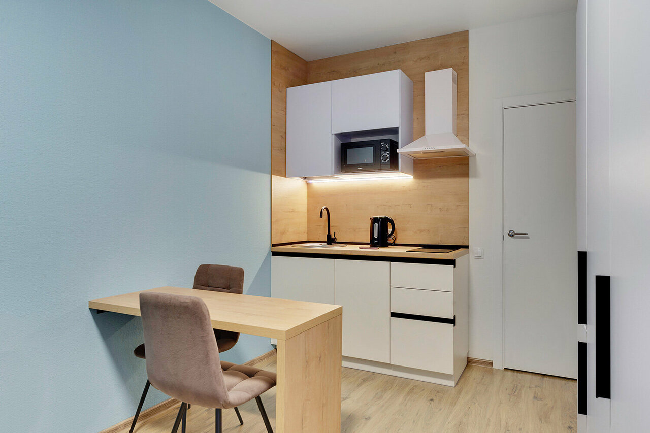 Нам попалась очень уютная студия. Видно, что квартира ухоженная. Из необходимого был даже пылесос. Очееь удивило наличие посудомойки (!) Капсул к ней. Также были капсулы для стиральной машины. Расположение удобное, у нас вид из окна был на озеро.