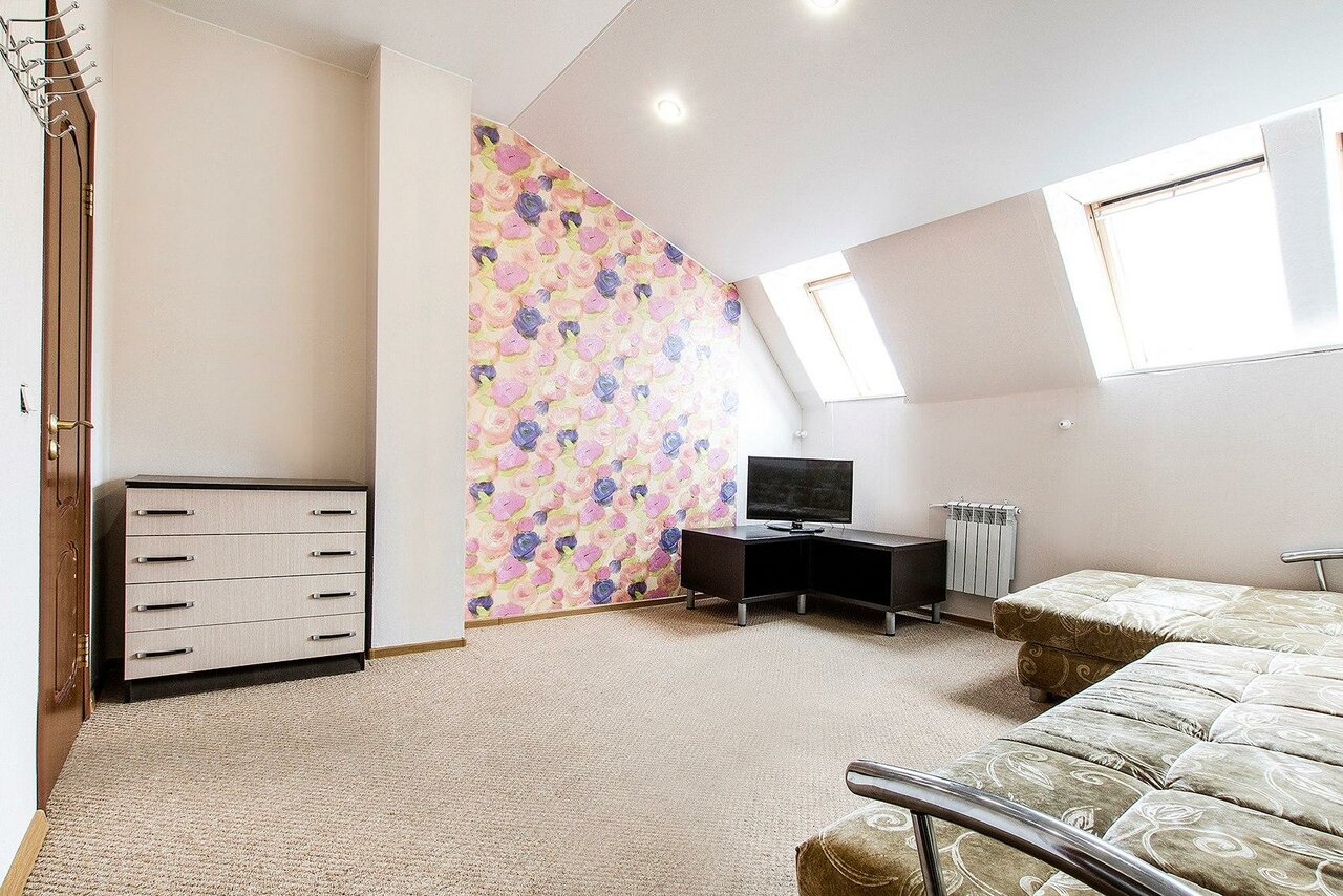из плюсов — локация очень хорошая, самый центр, общая кухня, холодильник, в общем коридоре камеры, уборка помещений — хорошая из минусов — 5 этаж (чердак)без лифта, номера очень маленькие, мансардные окна, в номере нет кондиционера, санузел общий — 2 кабинки с туалетом, 2 кабинки с душем (в душевой сильная влажность, духота), звукоизоляция плохая, стоит стиральная машинка, но пользоваться ей нельзя (только через горничную и за доп. оплату)