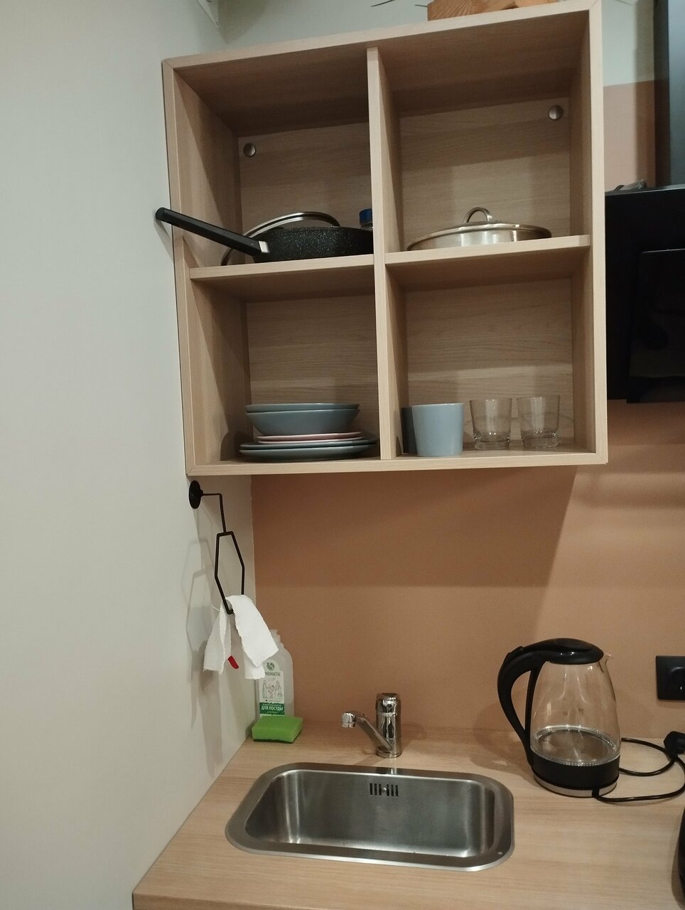 Если готовы чувствовать себя шпротой в банке — велкам! Площадь апартов такая, что завезя чемодан в номер — по нему довольно сложно передвигаться. Вдвоем — невероятно тесно! Банально в номере нет шкафа, вы чего!!??? И всего две вешалки в вашем распоряжении, ни в чем себе не отказывайте! Качество уборки плохое. В туалете и душе запах плесени, на душевой занавески склизские черные разводы. Больше сюда ни ногой. Да, расположение отличное, но даже оно не компенсирует все минусы.