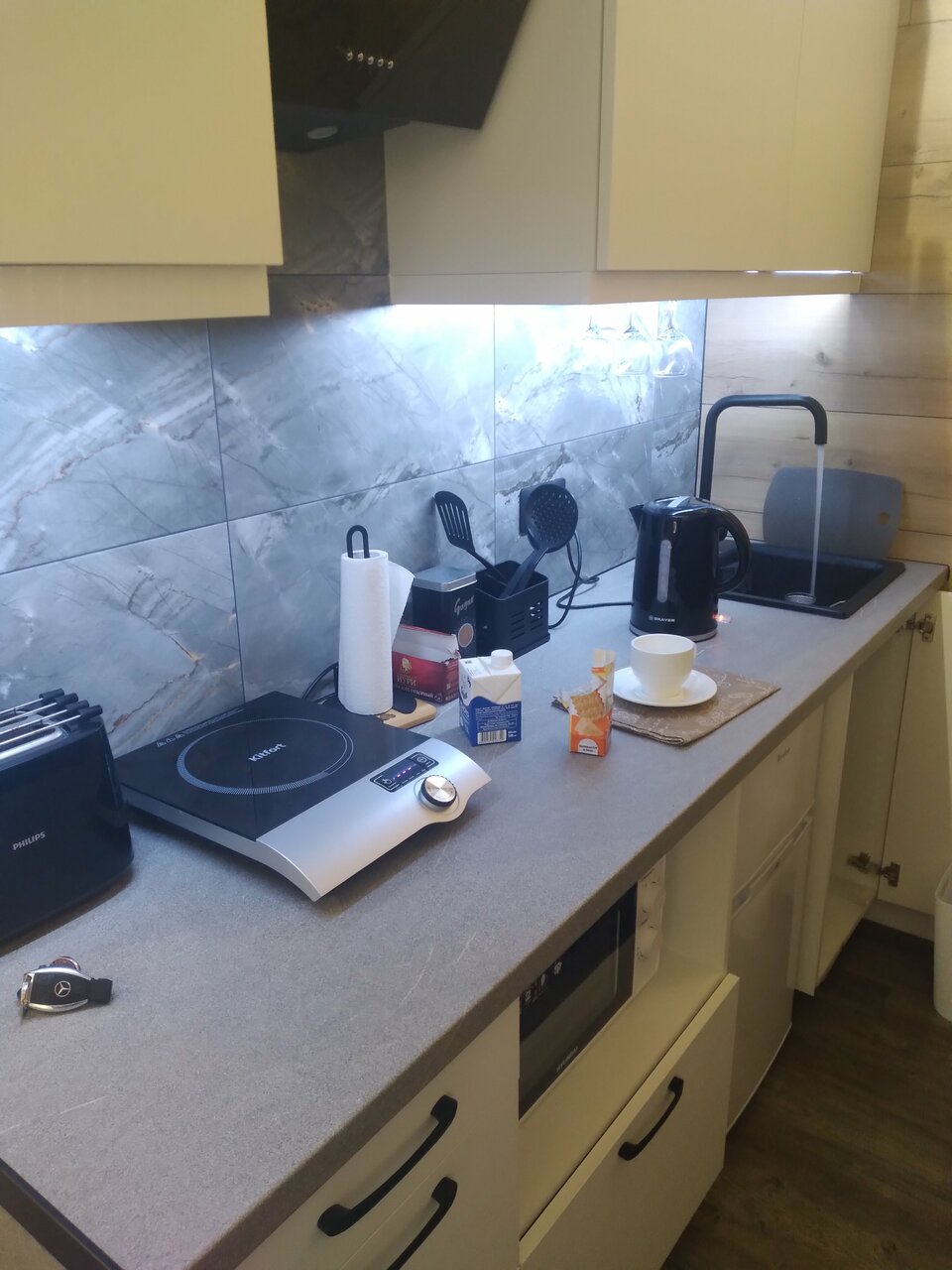 Отдыхали с мужем в августе 8 ночей. Комната студия в отличном состоянии, чисто и уютно, есть все необходимое для проживания. Современный ремонт и маленькие бытовые мелочи, которые делают проживание комфортным,такие как: гель для мытья посуды, стиральный порошок, соль, сахар, чай и масло (что очень выручает, когда заезжаешь усталым с дороги), утюг, фен, гладильная доска и сушилка для белья, вся необходимая посуда. Даже есть тапки. Расположены аппартаменты в спальном районе, окна выходят во двор, где не слышно шума машин, можно ночью спать с открытыми окнами, тихо и спокойно. Рядом есть Магнит и Пятёрочка, булочные и пекарни, множество кафе и столовых. Хозяин Евгений очень отзывчивый молодой человек, все разъяснит и объяснит, если есть такая необходимость, встречает даже когда у вас поздний заезд. В наше прибывание было отключено горячее водоснабжение, но это не помешало нам комфортно отдыхать, Евгений подключил для этого бойлер. Вернёмся сюда ещё.