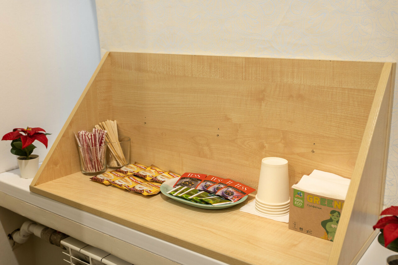 - Бесплатные чай, кофе, сахар на этаже.