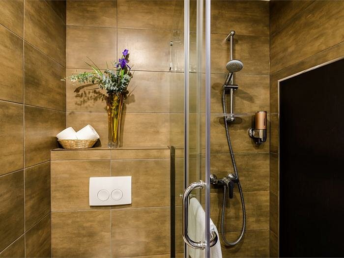 Волшебный и абсолютно уникальный номер с эркером! Есть все необходимое: халаты, тапочки, полотенца, зубной набор и др банные принадлежности, кухонный уголок (маленький холодильник, чайник, кофемашина, микроволновая печь, посуда). Чисто, приветливый персонал. Рекомендую!