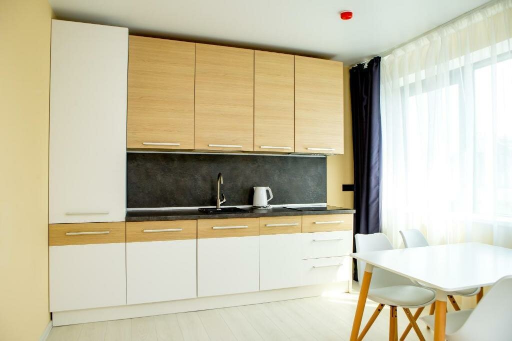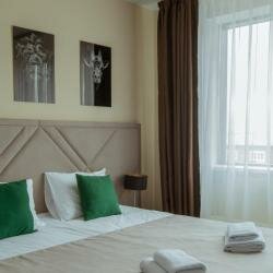 - Вежливый персонал.; Новый ЖК / современный ремонт.; Хорошее соотношение цена/качество.; Близость к остановкам общественного транспорта.; В номере есть вся необходимая техника (чайник, плита, холодильник, микроволновка, стиральная машина, посудомойка, утюг, фен, телевизор).