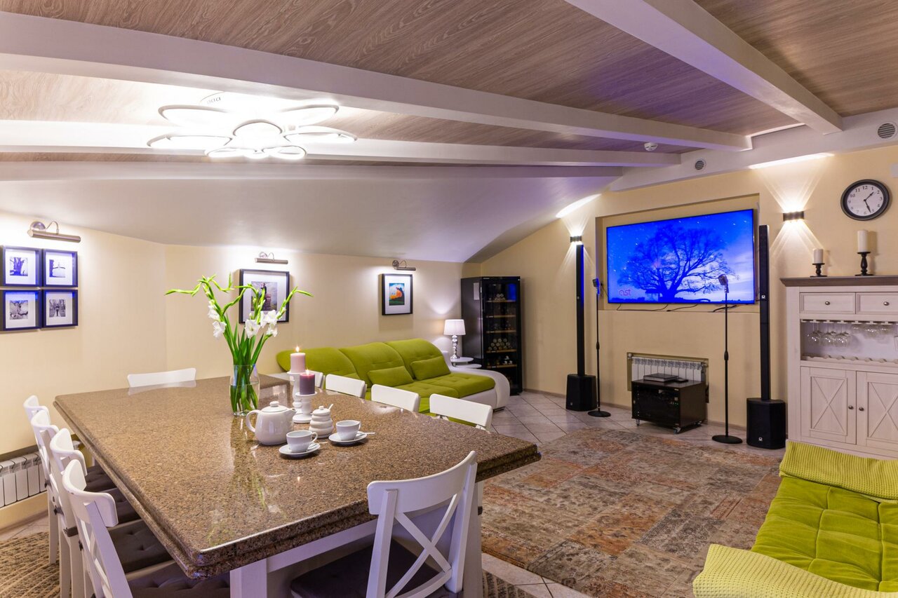- Фантастические условия для проживания двумя семьями или большой компанией.; Хамам, Русская парная.; Удобные спальные места.; Стильный и красивый интерьер.; Хорошая акустика и оборудование для караоке.